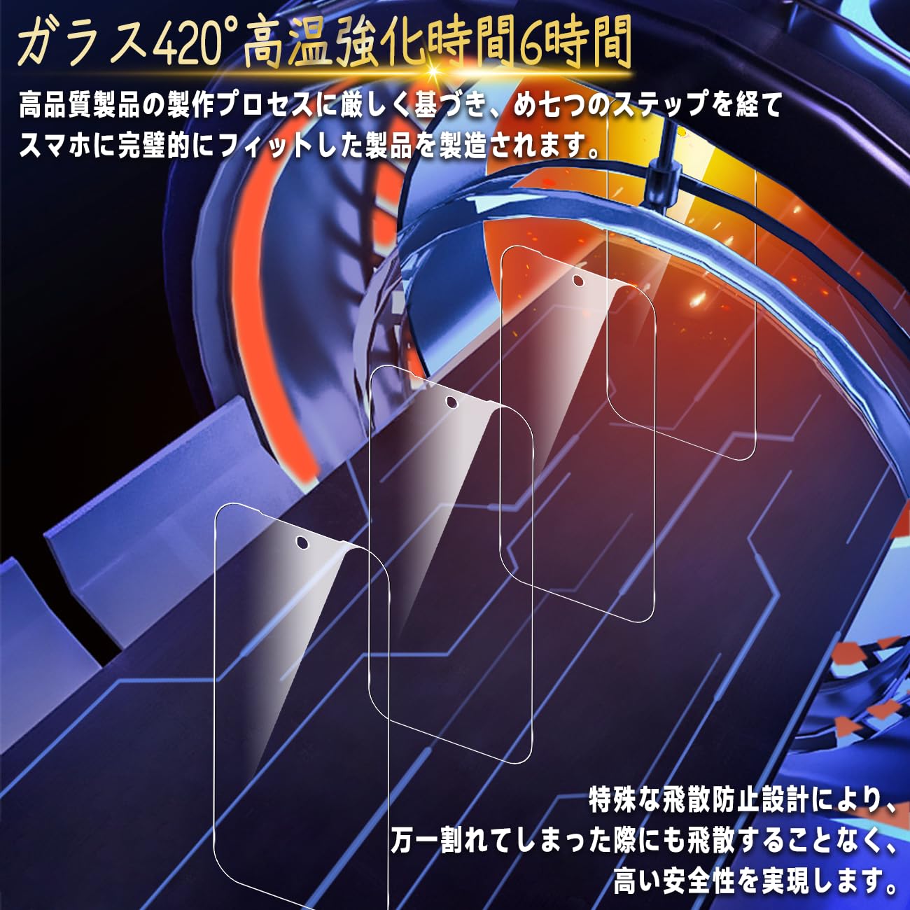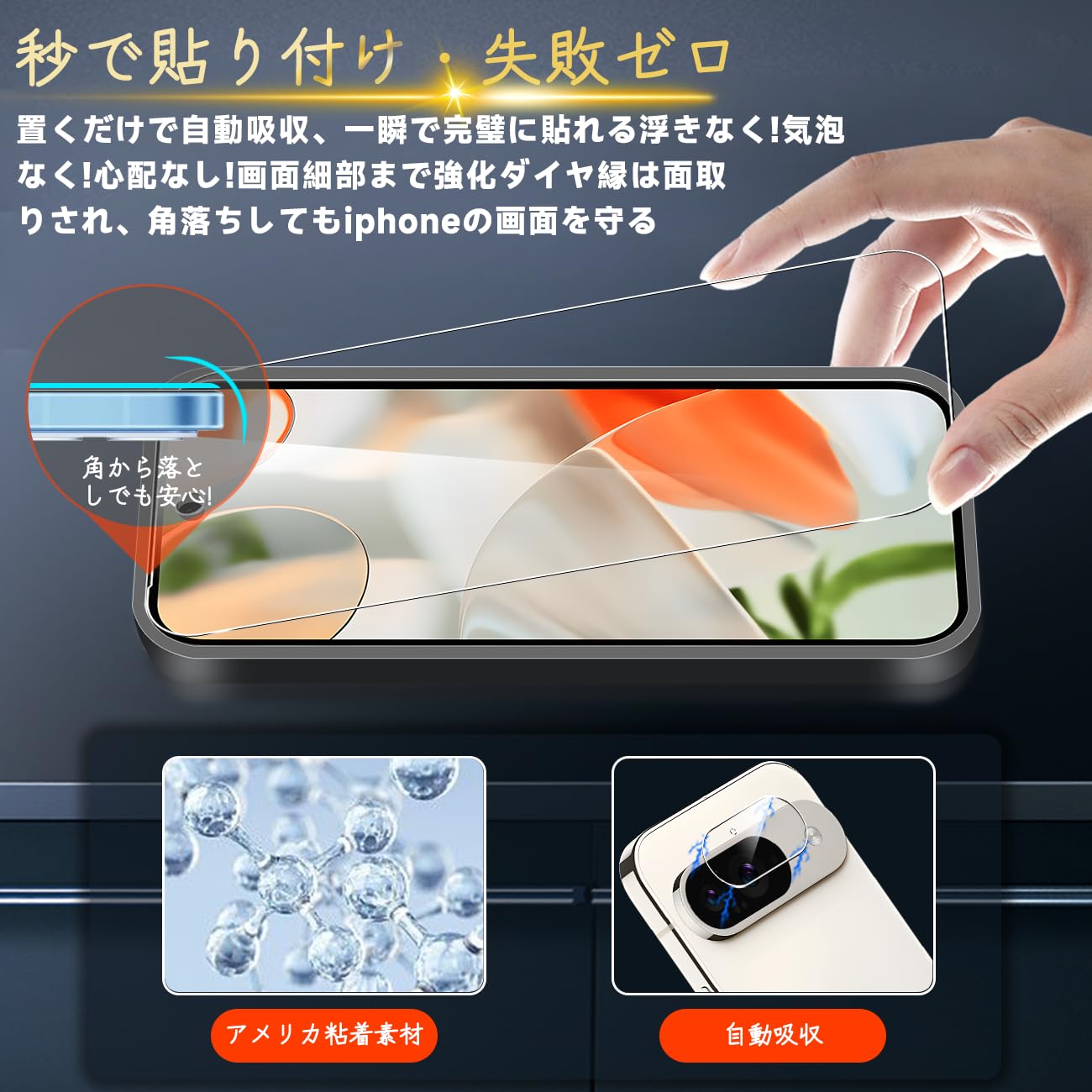 【高品質の材料の9H硬度】とレンズ保護フィルムはすべて旭硝子で作られており、スマホ保護フィルムの中で最高レベルの9H硬度に達しています、4.5時間以上の高温焼入れ処理を行い、スクリーンプロテクターの圧強度は 125mpa に達し、通常 ガラス の 5 倍になりました。しかもスクリーンプロテクターは衝撃を抑えるシリコンコーティングを内蔵しており、万が一ガラスが割れても、ガラスの破片が飛散しません。ハードコーティング技術は、衝撃を最小限に抑えて画面の破損を抑え、すり傷防止や指紋防止もしっかりとスクリーンを保護します。*大切な携帯電話の液晶画面を保護し、衝撃や表面のキズを防止します。