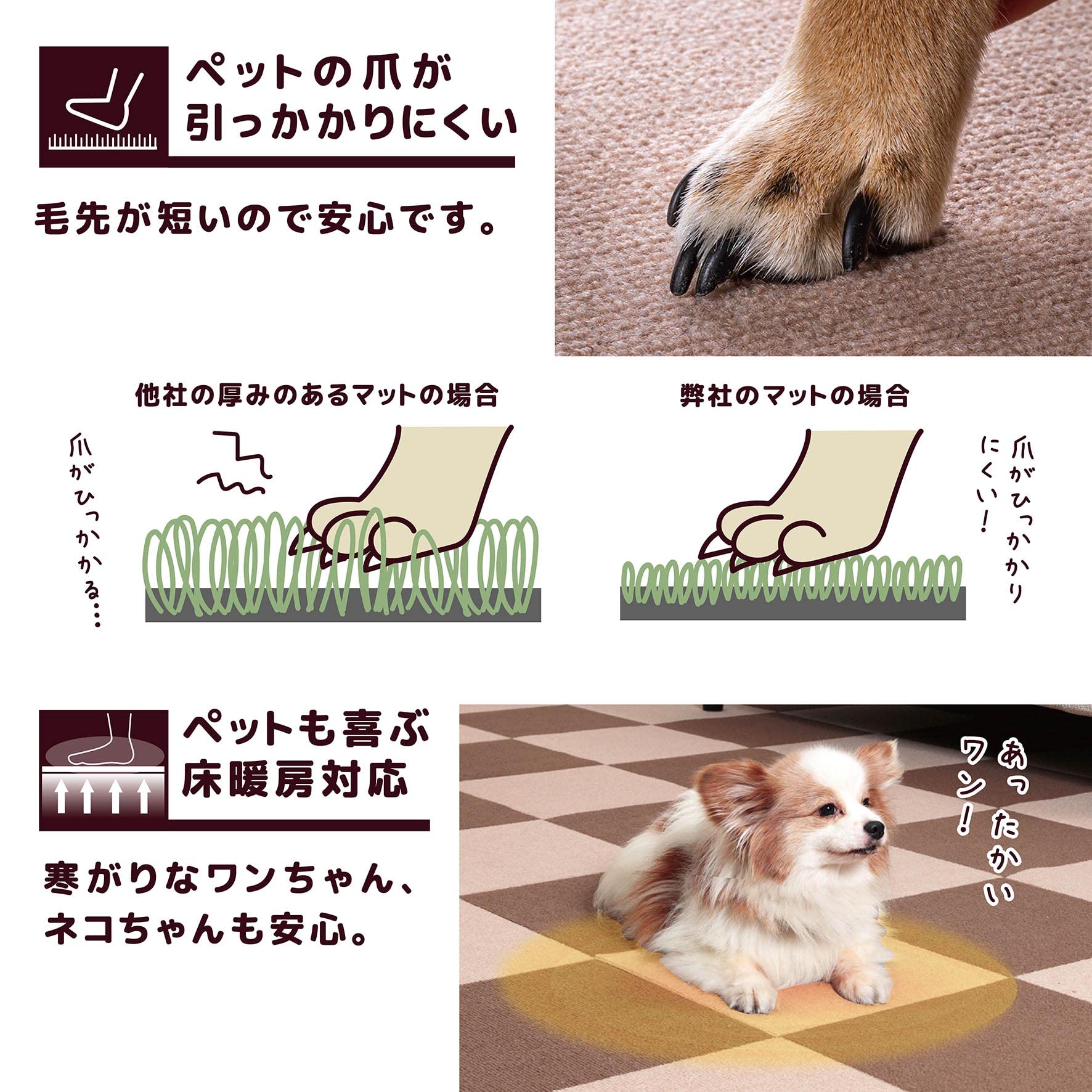 マットを敷くことで、フローリング床で滑っていたペットも爪を立てて歩くことができるので、足腰の負担を軽減できます。爪キズや汚れから床を守ります。裏面吸着加工でペットが走り回っても、マットがズレたり、引っ掛かることがないので安心です。汚れたら洗濯機で洗えるのでお手入れが簡単です。洗濯しても、吸着効果は変わりません。繰り返し使用頂けます。ハサミで手軽にカットできます。生地が薄いので、つまずきにくく、扉の開閉の妨げにもならず、廊下にも最適です。掃除機をかけても吸い上がらず、楽にお掃除できるのでいつも清潔に保てます。アンモニア消臭加工、床暖房OKで一年中使用できます。