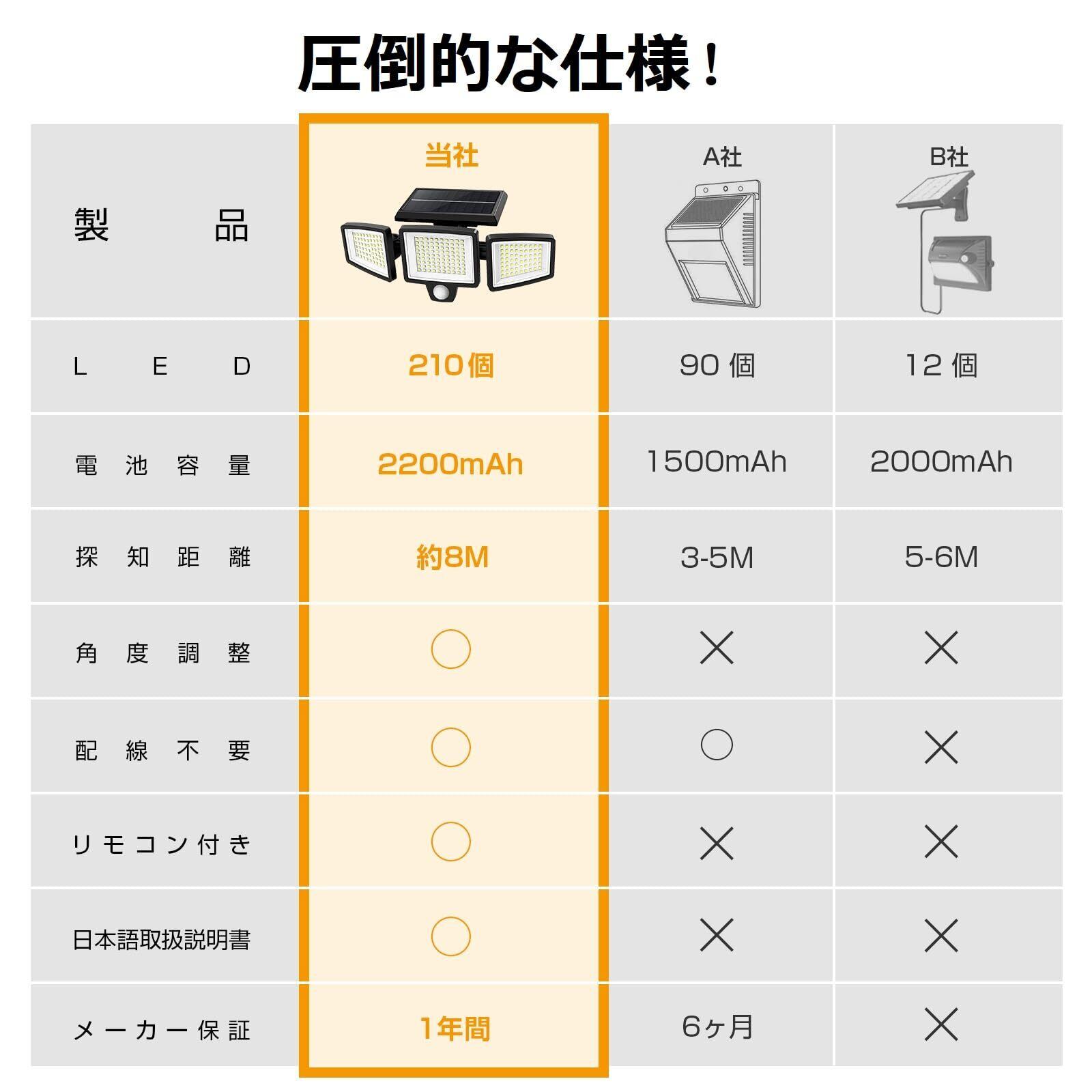 【新世代210個高輝度LED・3面発光・270°照明】日中に点灯しなく、夜間に点灯。このソーラーライトは昼光色7000k超高輝度の210個LEDチップを搭載しており、明るさは2500ルーメンを提供でき、従来の製品よりも大きく、効率的で、照明効果に優れています。3面発光のデザインで照明角度が270°に達すだけでなく、両側のライトとラーパネルは上下左右回転可能で、お好みの照射方向に合わせて自由に調整できます。