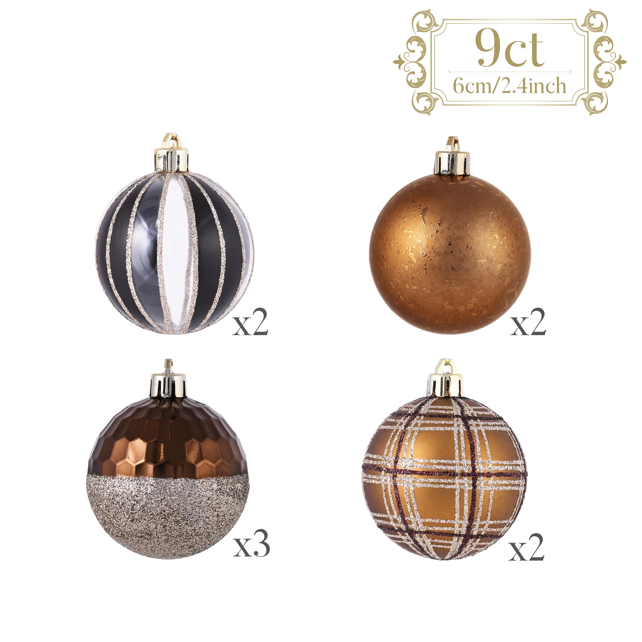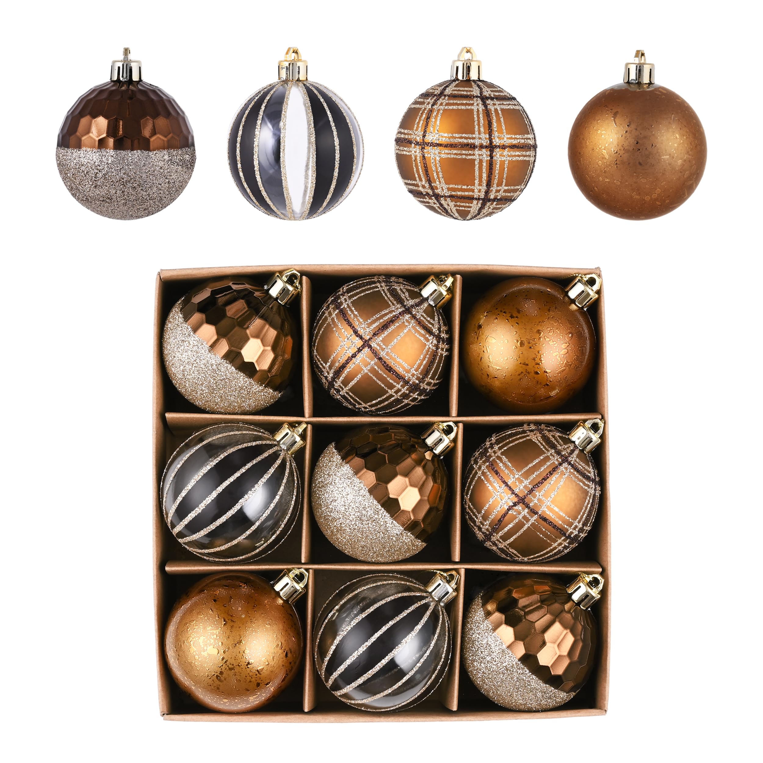 【パッケージとサイズ】クリスマスオーナメントセットには、金銅色のクリスマスボール9個が含まれています。各ボールはシームレス接続を採用し、洗練された外観を作り出しています。ボックスには高品質のエコボール箱を採用し、贅沢感を加えます。