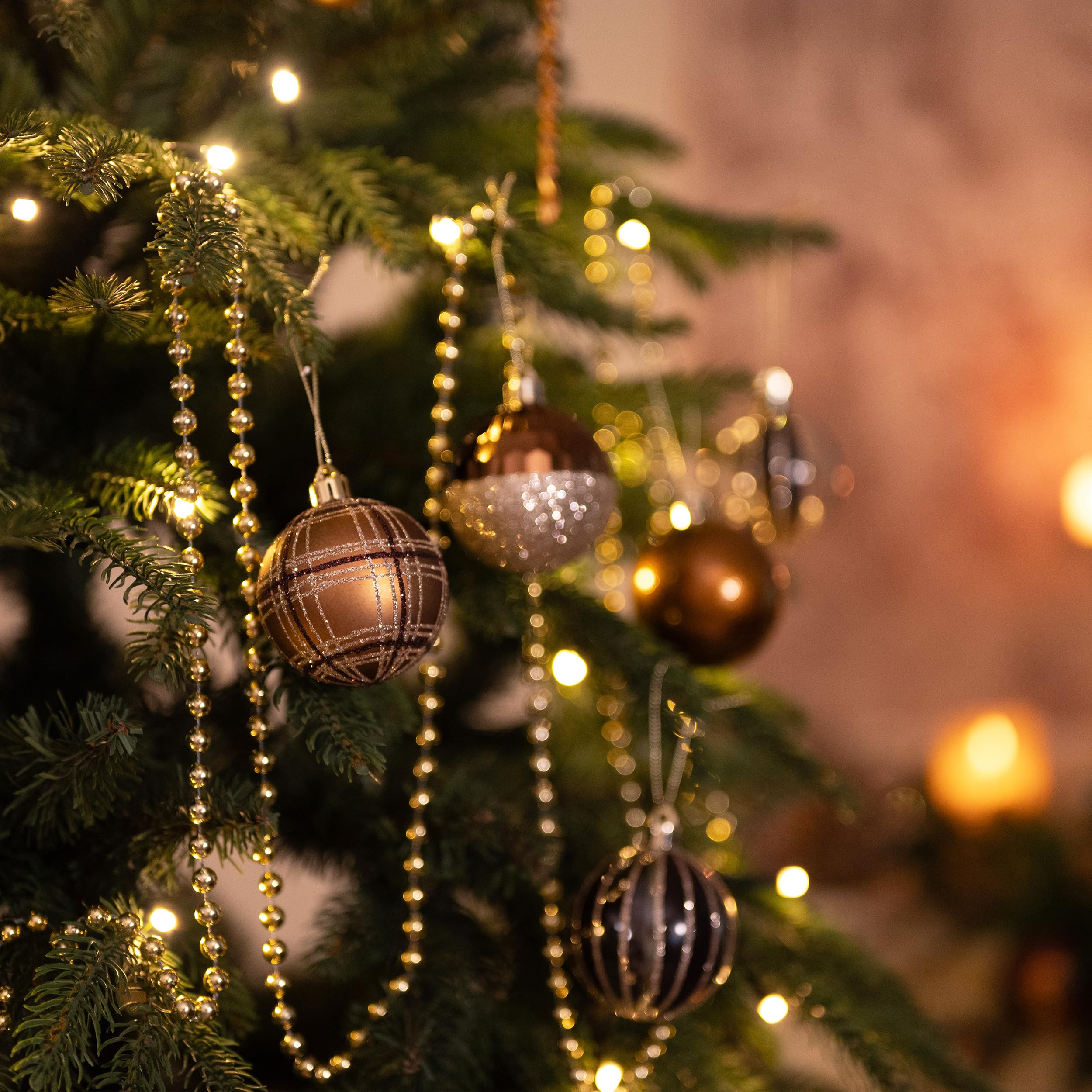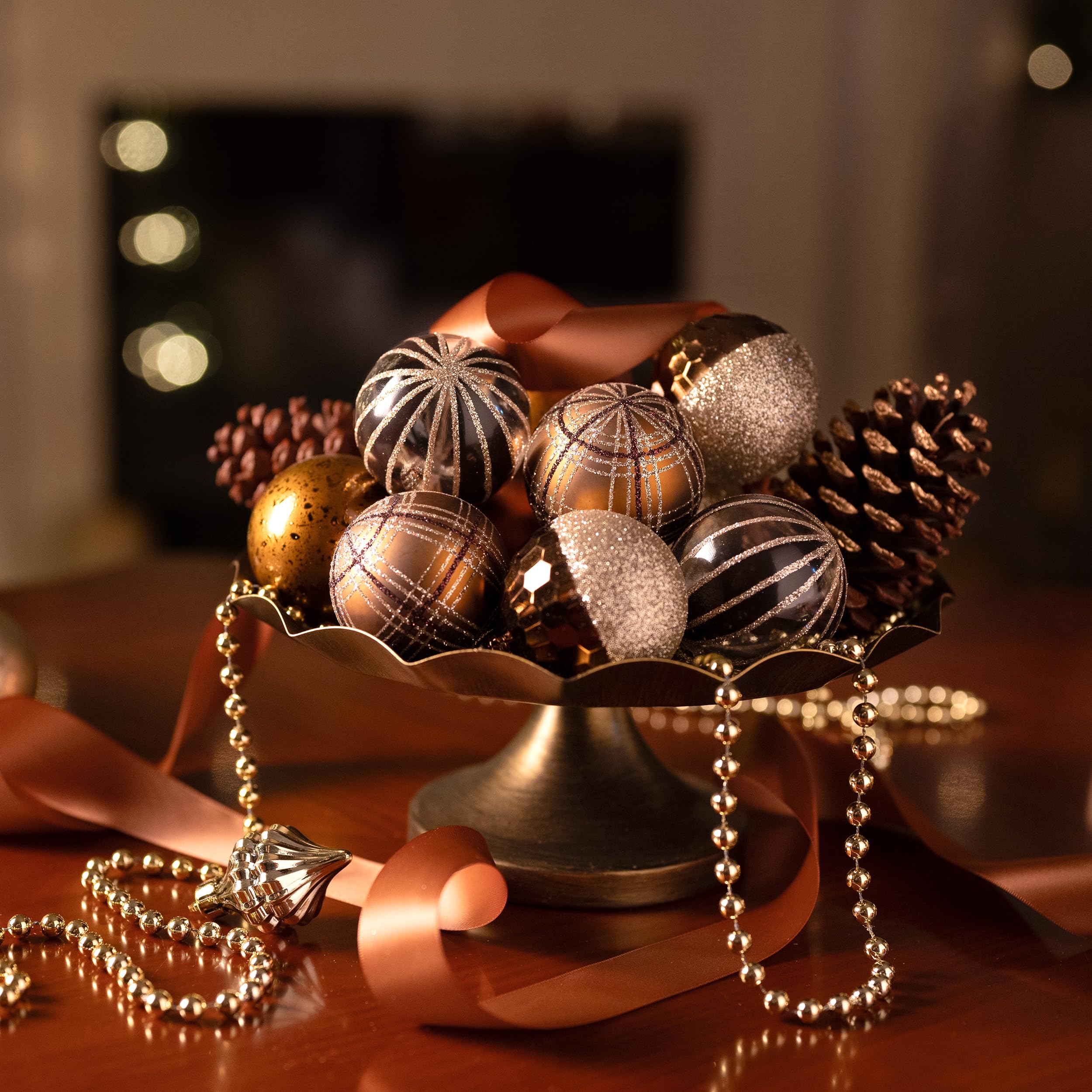 【色合わせ】クリスマスボールオーナメントは3つの独特な表面処理(光沢、マット、グリッター)を施されます。表面には異なる精緻なテクスチャがあります。それぞれのボールは丹念に吹き込まれ、手作業で塗装されています。銅色と金色があなたの家にラグジュアリーな雰囲気をもたらします。