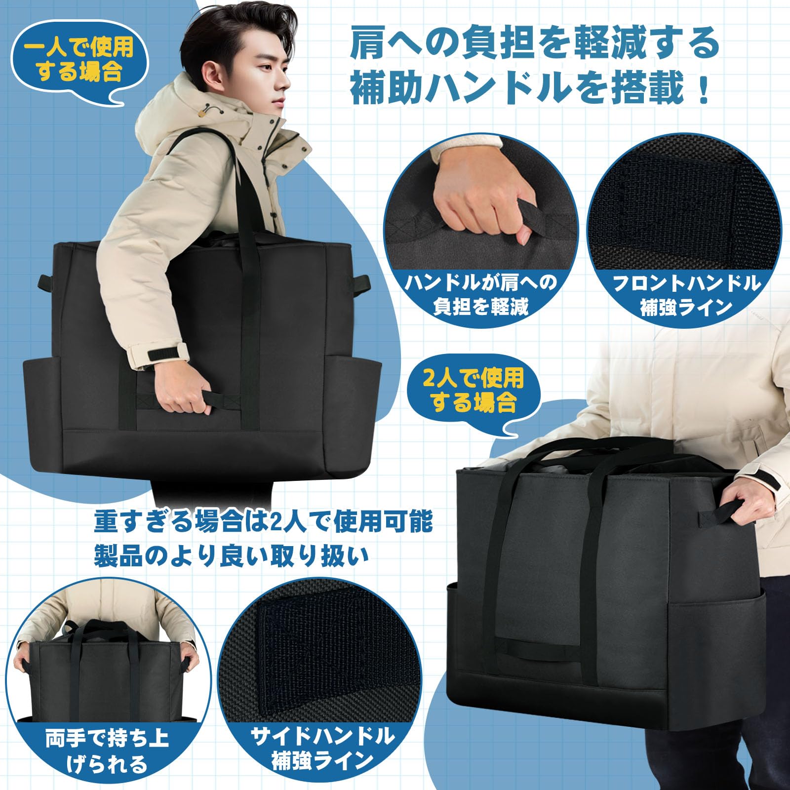 【ショルダー/ハンドバッグ&3つの補助ハンドル】大容量トートバッグ肩掛けだけではなく、手持ちとしても使えるため、シーンに応じて使い分けることができます。この大きなトートバッグをより実用的にするために、3つの補助ハンドルを追加しました。補助ハンドルは、女性や背の低い人など力の弱い人が大量の荷物を運ぶ際に、肩にかかる負担を軽減する設計もされています。