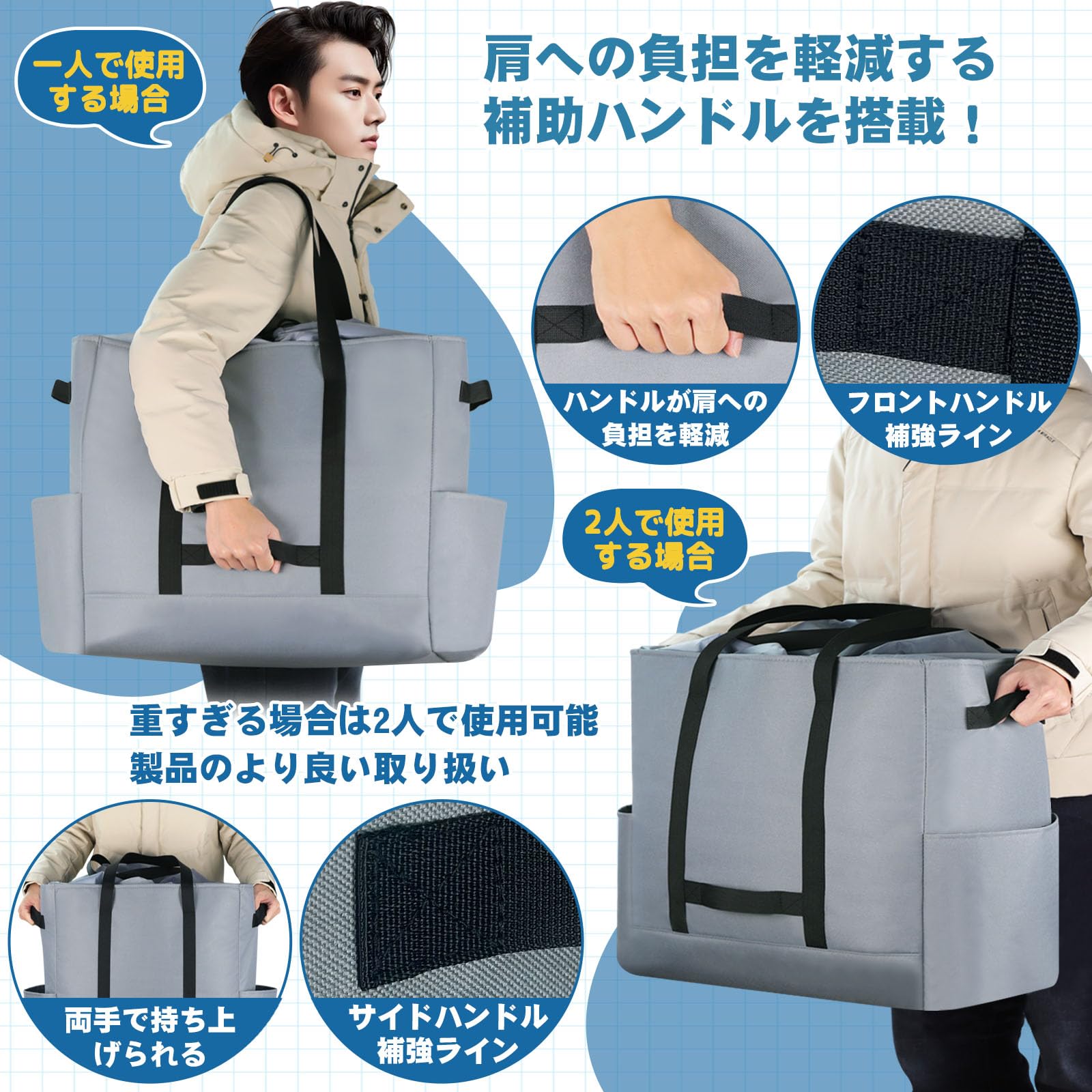 【ショルダー/ハンドバッグ&3つの補助ハンドル】大容量トートバッグ肩掛けだけではなく、手持ちとしても使えるため、シーンに応じて使い分けることができます。この大きなトートバッグをより実用的にするために、3つの補助ハンドルを追加しました。補助ハンドルは、女性や背の低い人など力の弱い人が大量の荷物を運ぶ際に、肩にかかる負担を軽減する設計もされています。