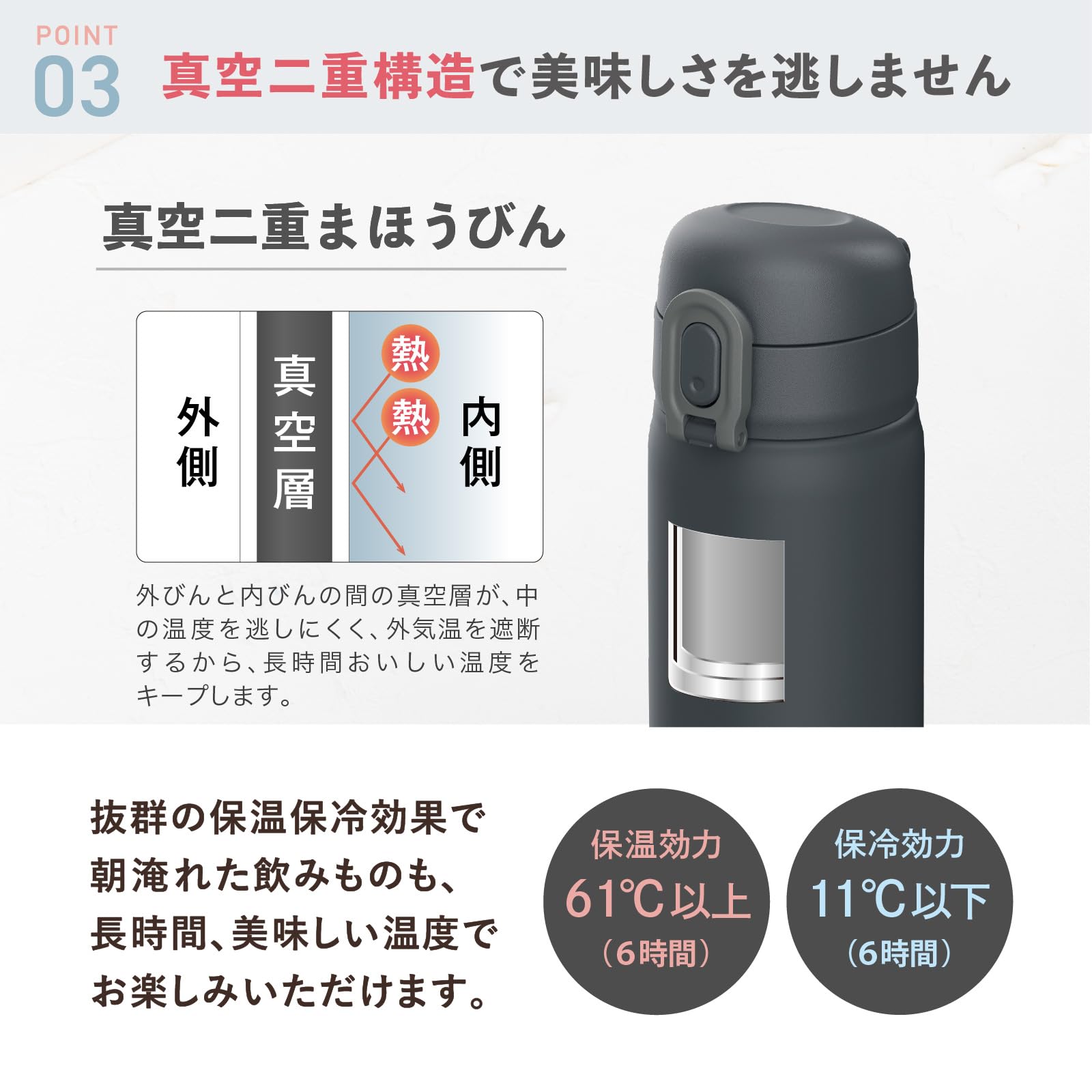 保温効力:6時間/61度以上・1時間/85度以上、保冷効力:6時間/10度以下