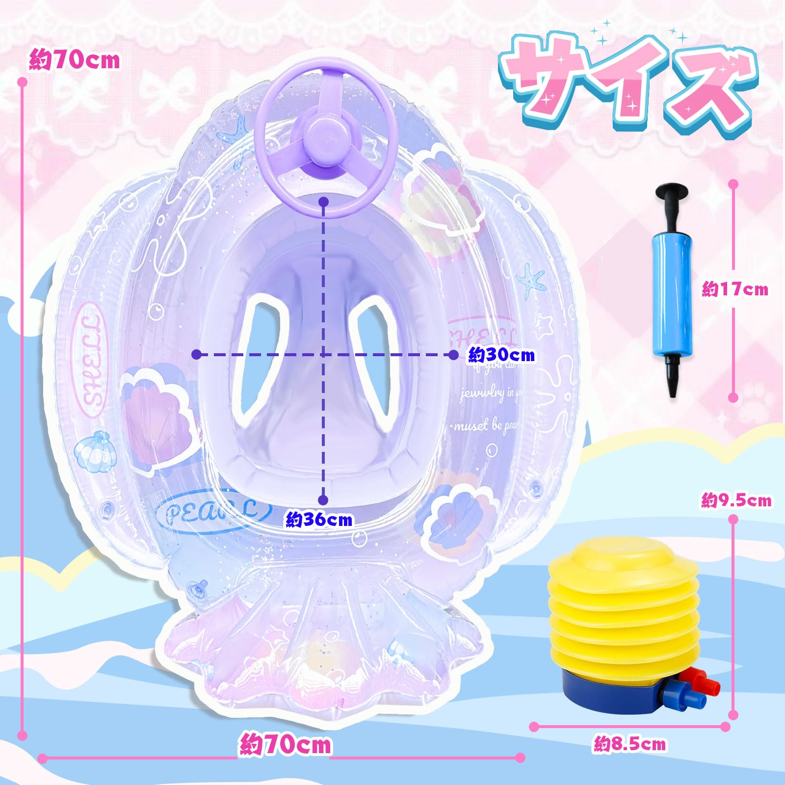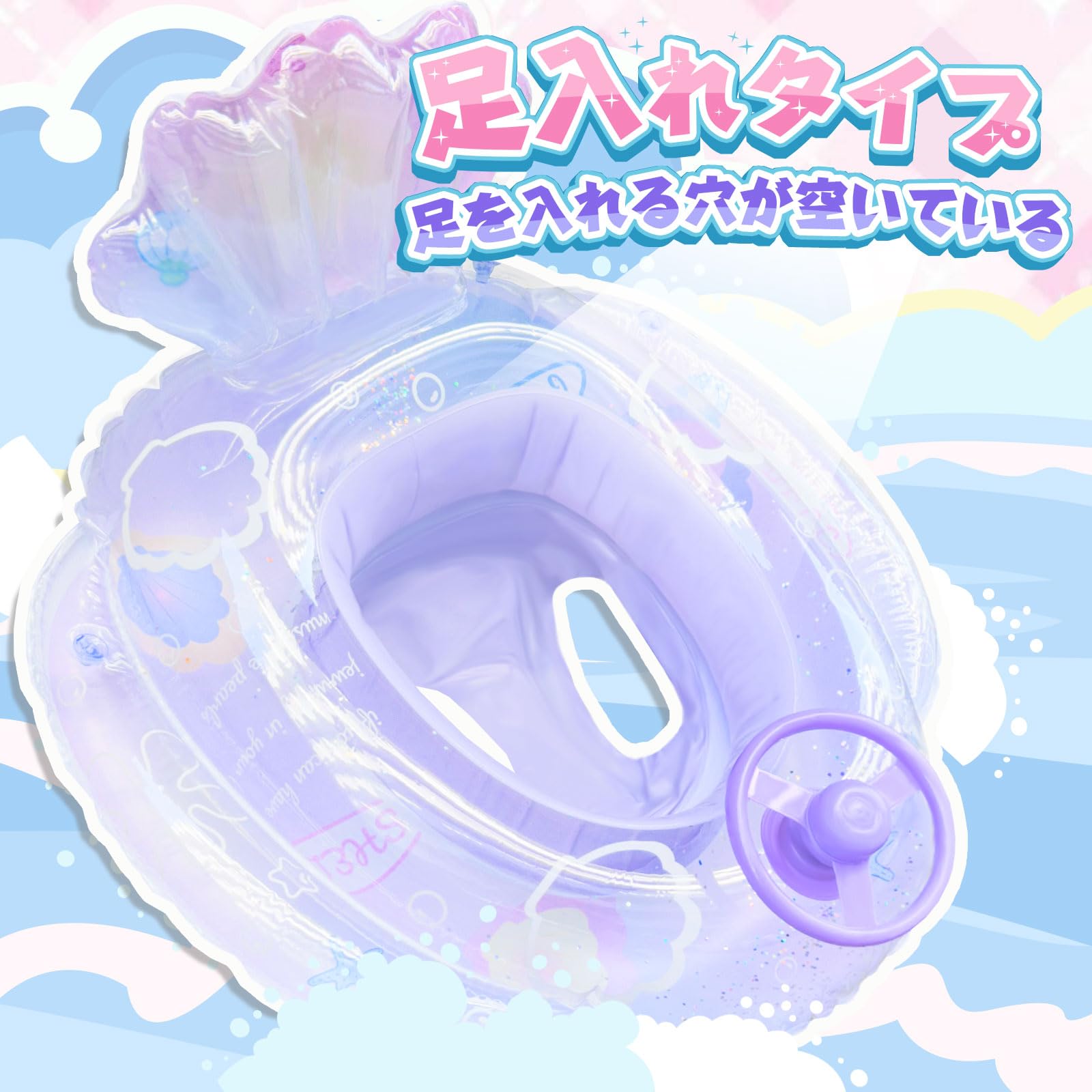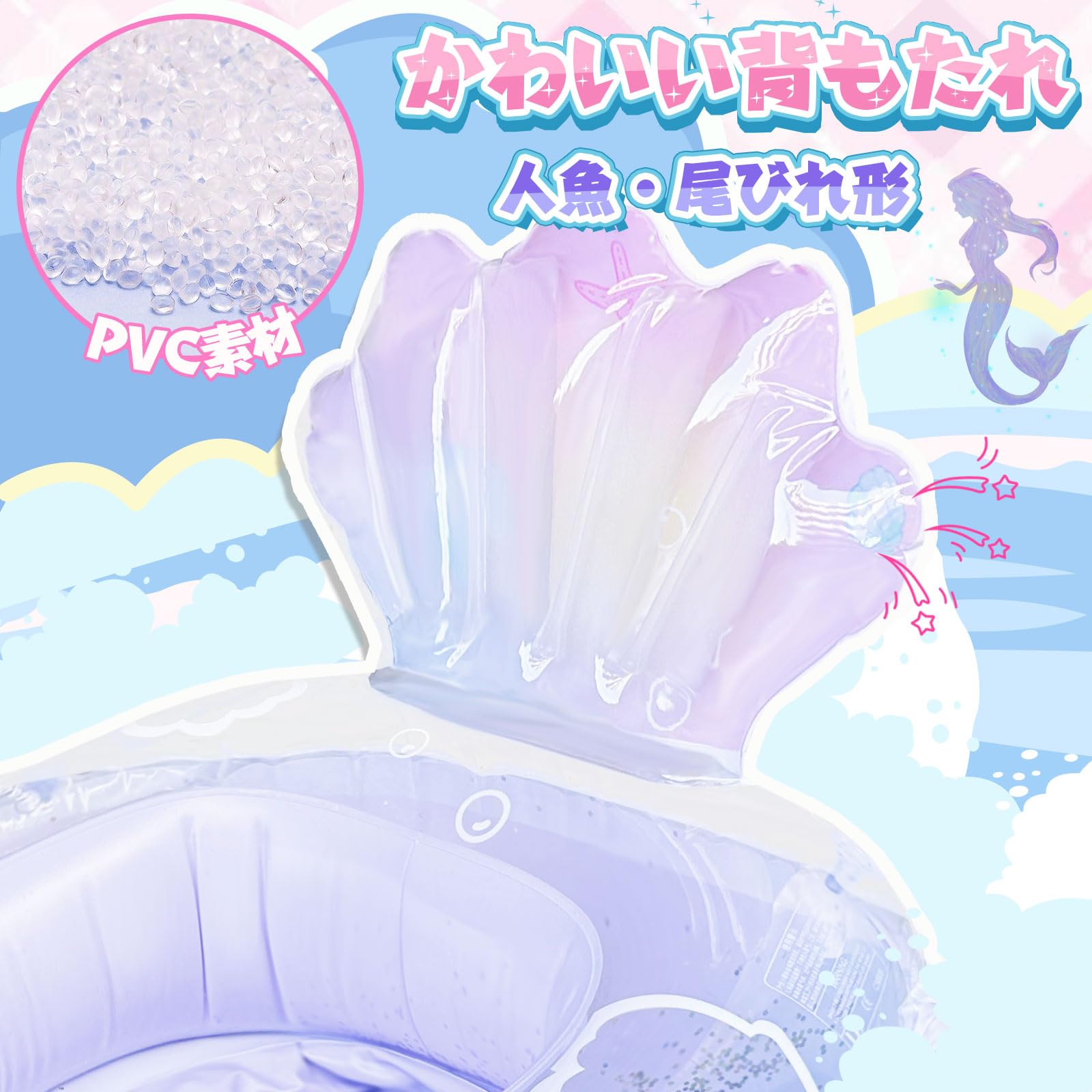 PVC製:PVC素材を使用したうきわです。見た目が半透明で、キラキラ輝くスパンコールを入れ、水面と日差しに反射してきれいです。サイズは約70*70*38CMで、ご了承ください。