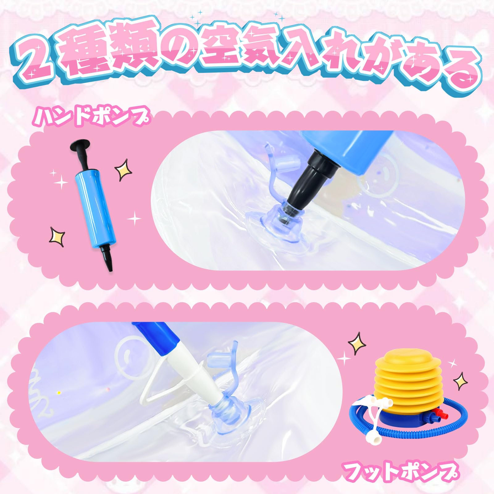 2種類の空気入れ:プラスチック製のハンドポンプと足踏み式ポンプがセットになっています。少しの力で空気を充填することが可能、とっても便利です。またサイズがピッタリで携帯性の高さもメリットです。