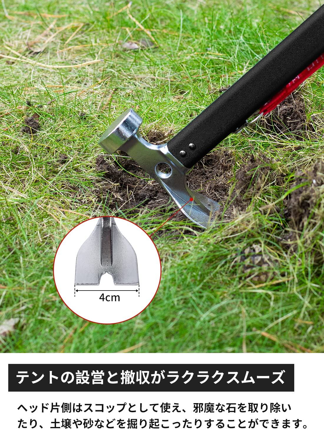 【3in1多機能ハンマー】:デザイン性と機能性を兼ね備えました。ペグの打ち込み、ペグの引き抜き、穴掘りがすべてこの一本でできます!①テントハンマーの頭部は重量感のある高炭素鋼で、固い地面でもぺぐを固定できます。②ヘッド片側はスコップとして使え、邪魔な石を取り除いたり、土壌や砂などを掘り起こったりすることができます。③ペグハンマーの後部に設けられたフックとホールを使ってあらゆるタイプのペグを抜くことができます。