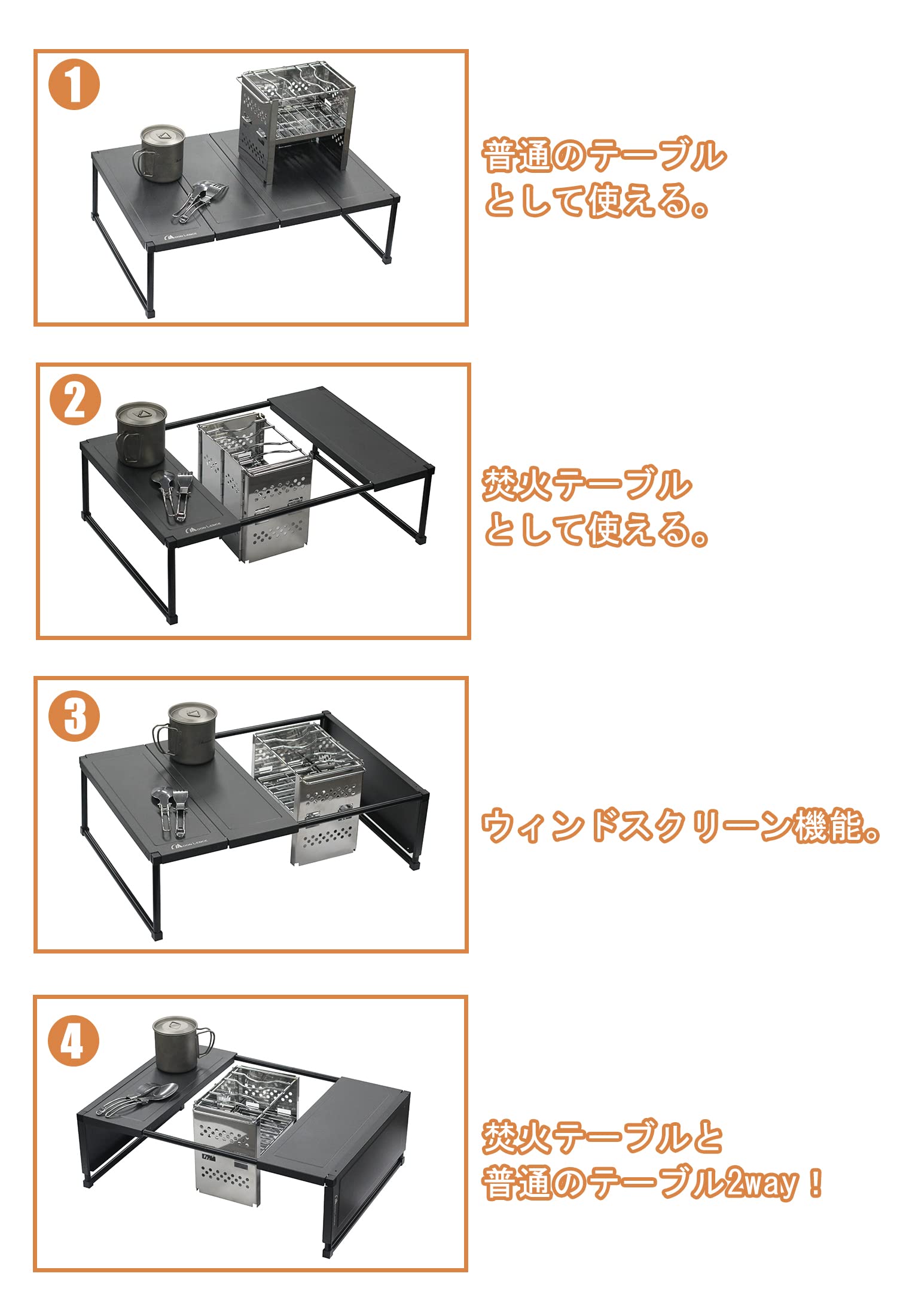 【多機能のアウトドア テーブル】色々な使い方:天板を上に置くと普通のテーブルとして使えます。天板を側面に置くと風除け板になります。