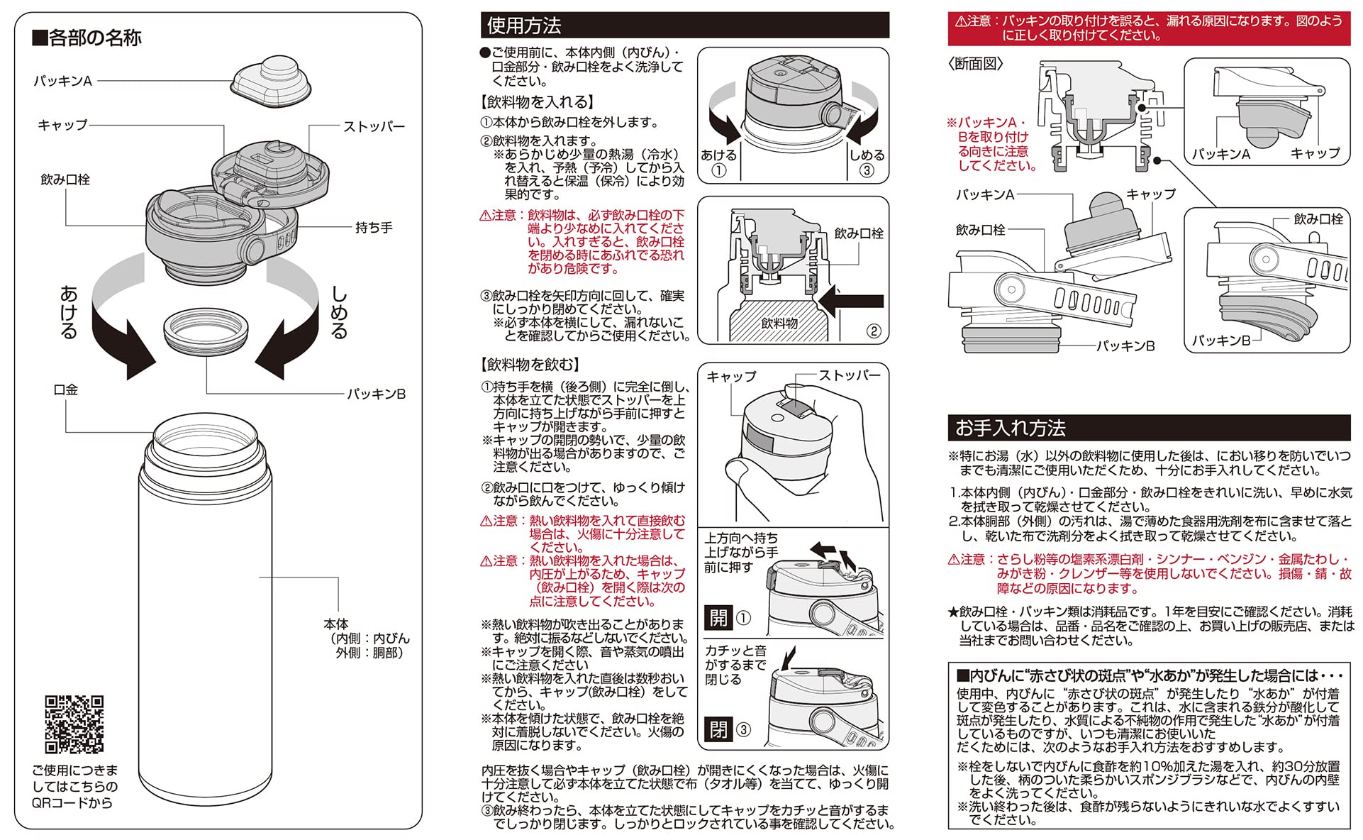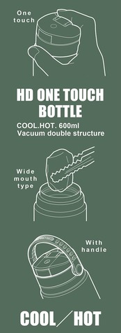 材質:内びん/ステンレス鋼、胴部/ステンレス鋼(アクリル樹脂塗装)、口金/ステンレス鋼、飲み口栓/ポリプロピレン、持ち手/熱可塑性エラストマー、パッキン/シリコーンゴム