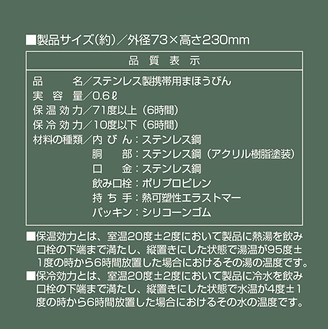 保温効力:71度以上(6時間)、保冷効力:10度以下(6時間)