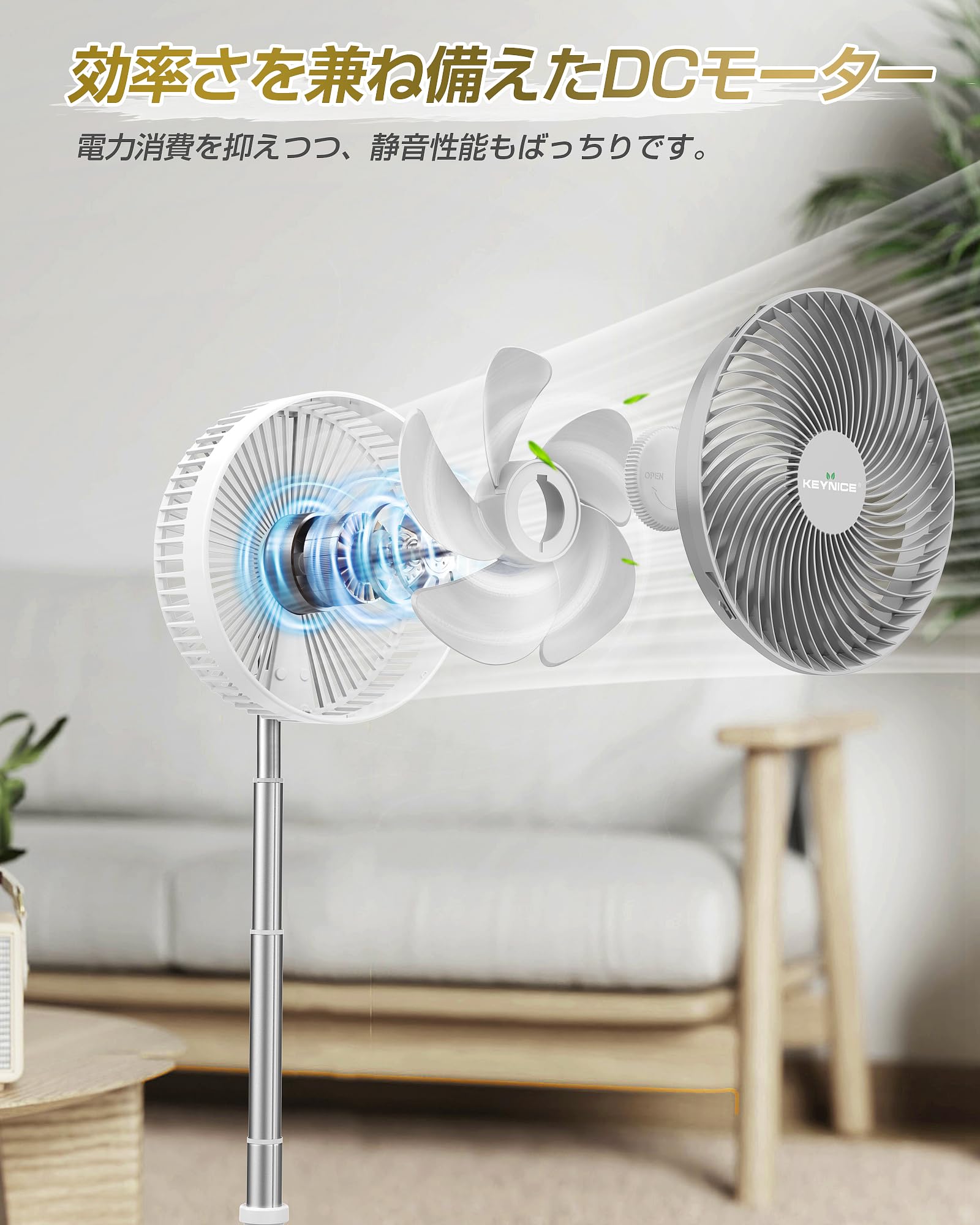 首振り&省エネDCモーター:左右60°自動首振り機能と上下角度調整で、部屋中に均一な涼しさの維持が可能。ACモーターよりも静かで省エネのDCモーターを採用し、微風時の騒音はわずか25dB、消費電力は10Wと経済的です。