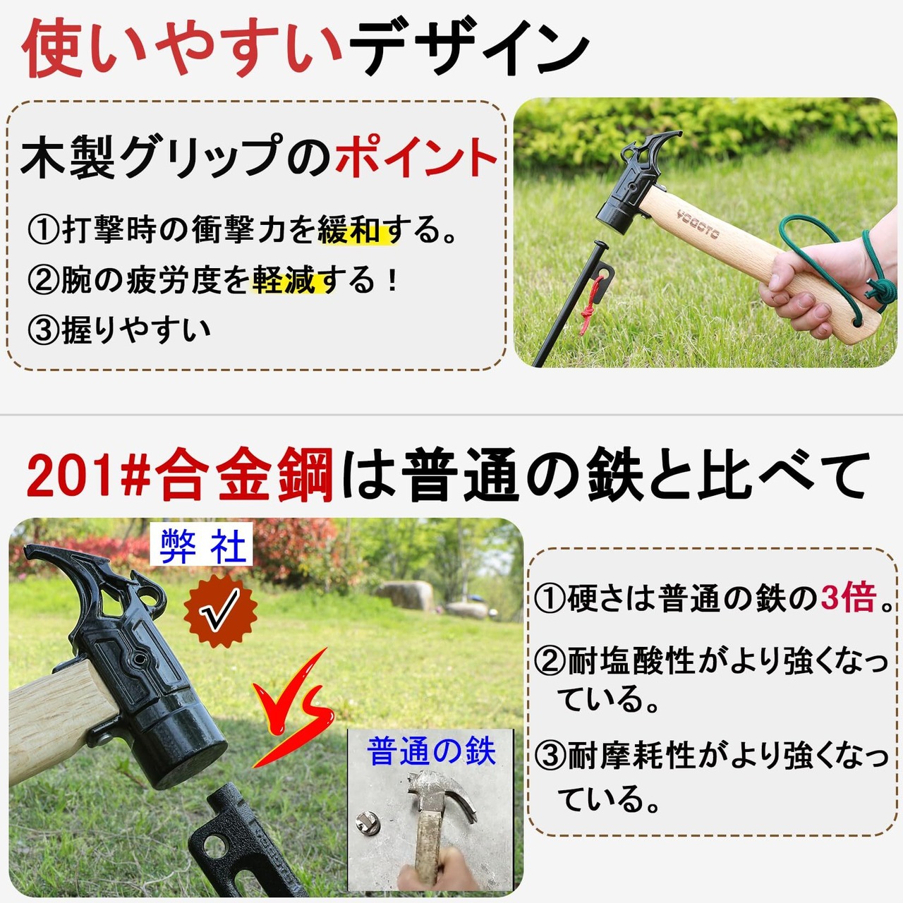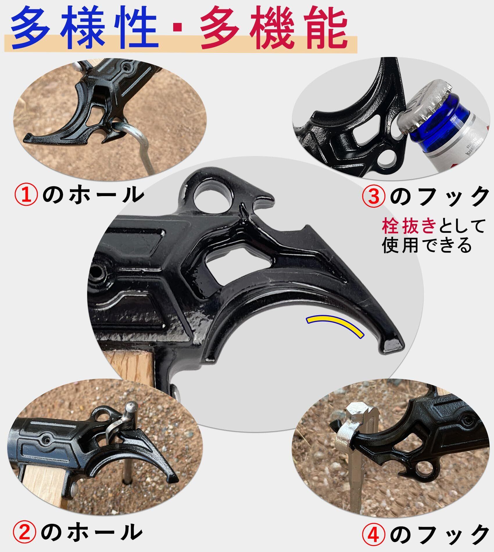 【使いやすい】 適度な重量を持つ丈夫な一体型ヘッドで、手に馴染みやすくて初心者にも使いやすいです。ペグ打ちとペグ抜きだけではなくて、アウトドアでボトルの栓抜きとしても使用できます。