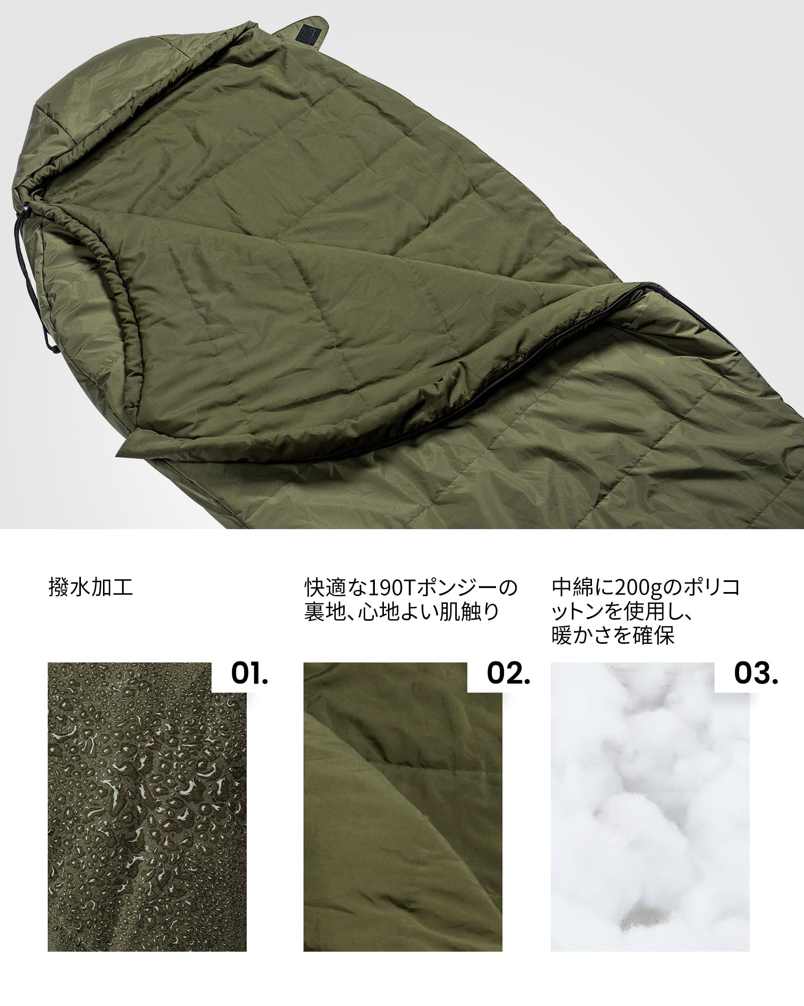 【撥水加工・乾きやすい】ファイバーコットンは撥水加工で、濡れても保温性があり、速乾性備えております。湿気や軽雨は防ぎ、一晩中爽やかな眠りを提供できます。足底の吊り下げデザインにより、干して収納するのも簡単です。ジッパーは下から開けて、寝袋から足を出すことができ、動きやすさと通気性を確保することができます