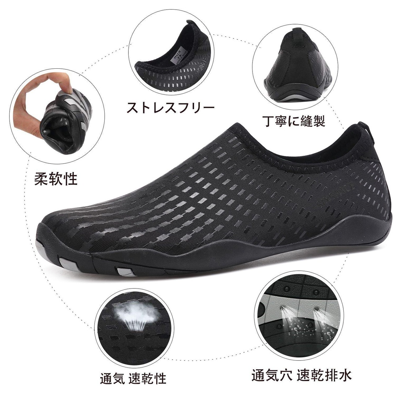 「ソール」:ソールは滑り止めのゴムです。だから、水、ジム、ビーチで楽しみを持つことができます。ソフトで柔軟です。