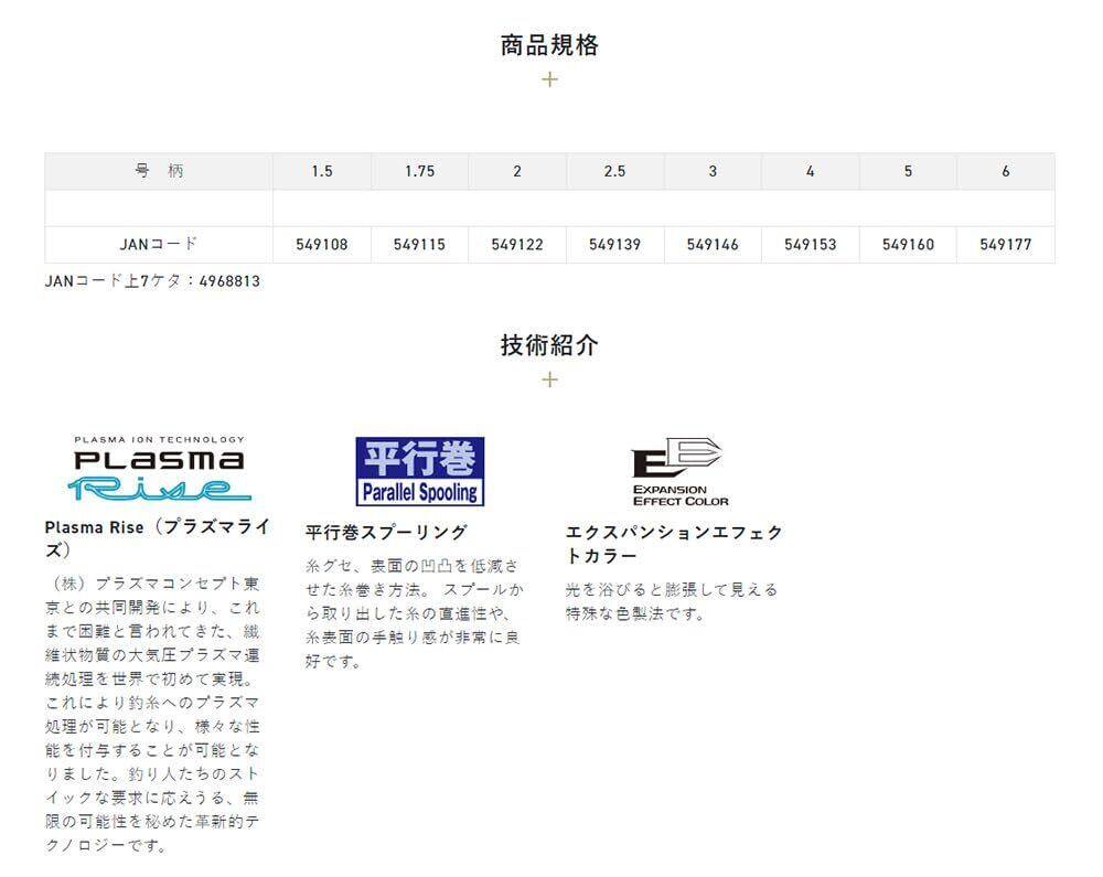 コンセプト: "白糸のキング"!! 光を浴びると膨張して見える特殊な色製法でアタリをあぶり出す。「プラズマライズ」でナイロンラインの弱点でもある吸水による劣化を大幅に軽減。