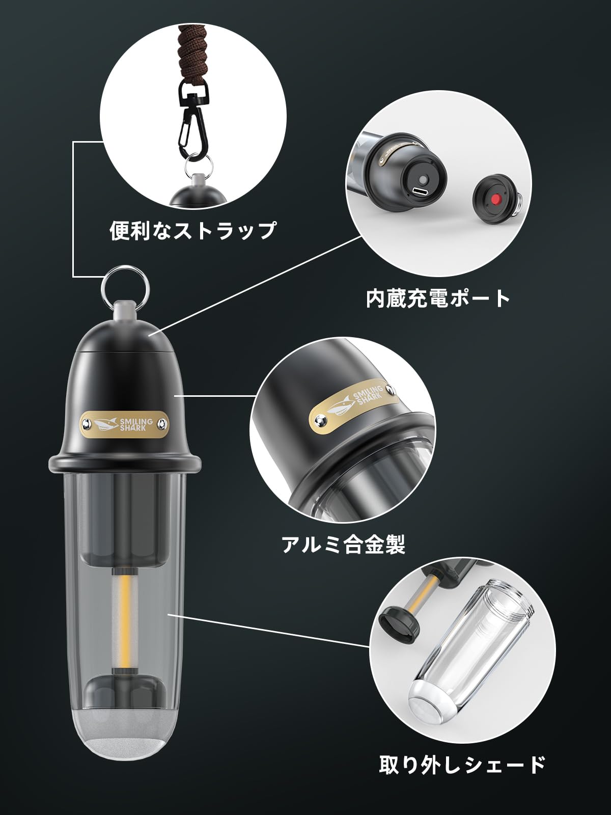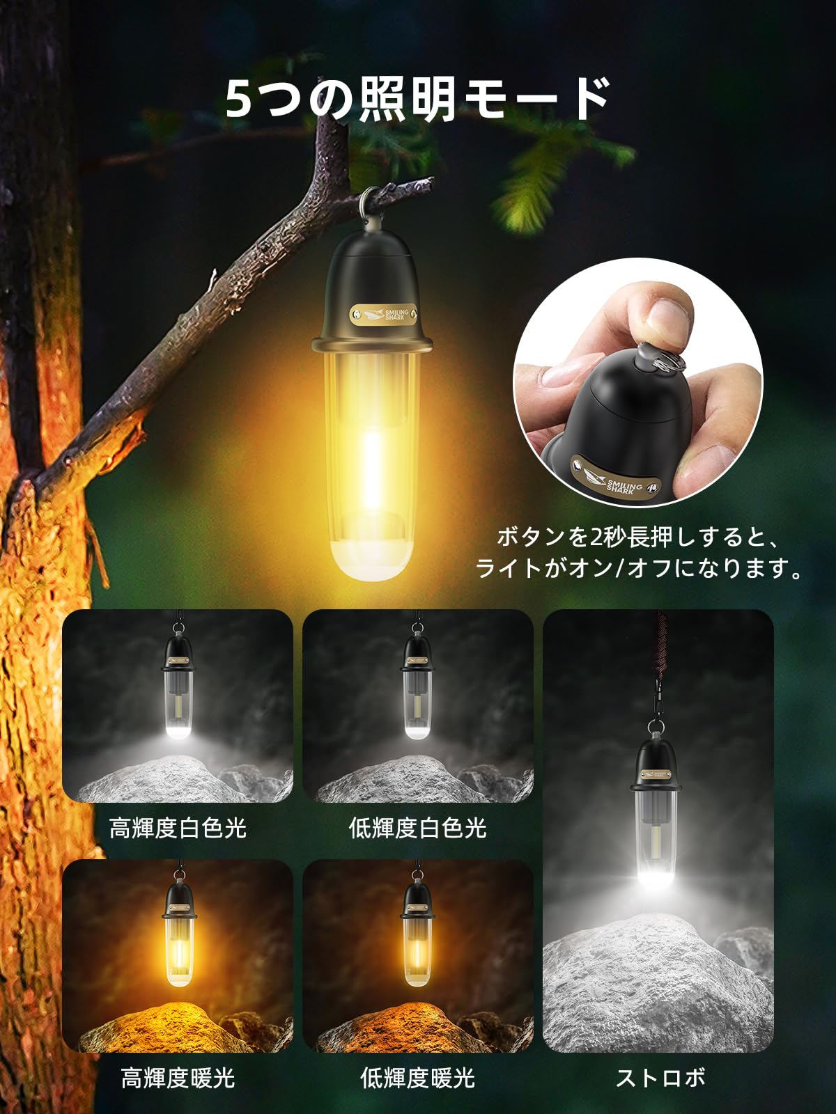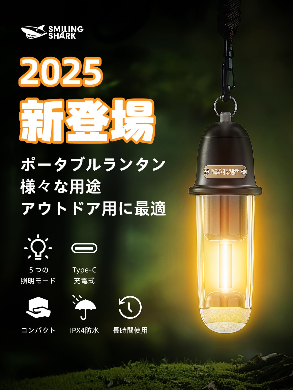 Smiling Shark LEDランタン 【2025新登場・多機能キャンプランタン】 LEDランタン 電球色 昼白色 5つ照明モード IPX4 防水防塵 懐中電灯 Type-C充電式 小型 持ち運び便利 アウトドア用 キャンプ用 登山 夜釣り 防災 停電 緊急 非常用 お祝い日 贈り物 ギフト 日本語取扱説明書(ブラック)