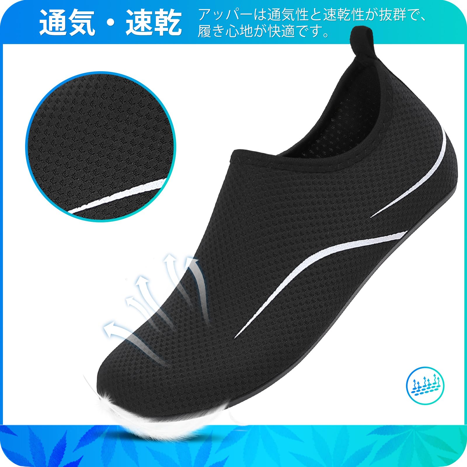 【アッパー素材】当店のウォーターシューズのアッパーはネオプレン+ゴムを採用しておりますので、伸縮性、排水性、通気性に優れています。 メッシュ構造で蒸れを防ぎ、乾燥しやすく、足の爽やかさを保てます。