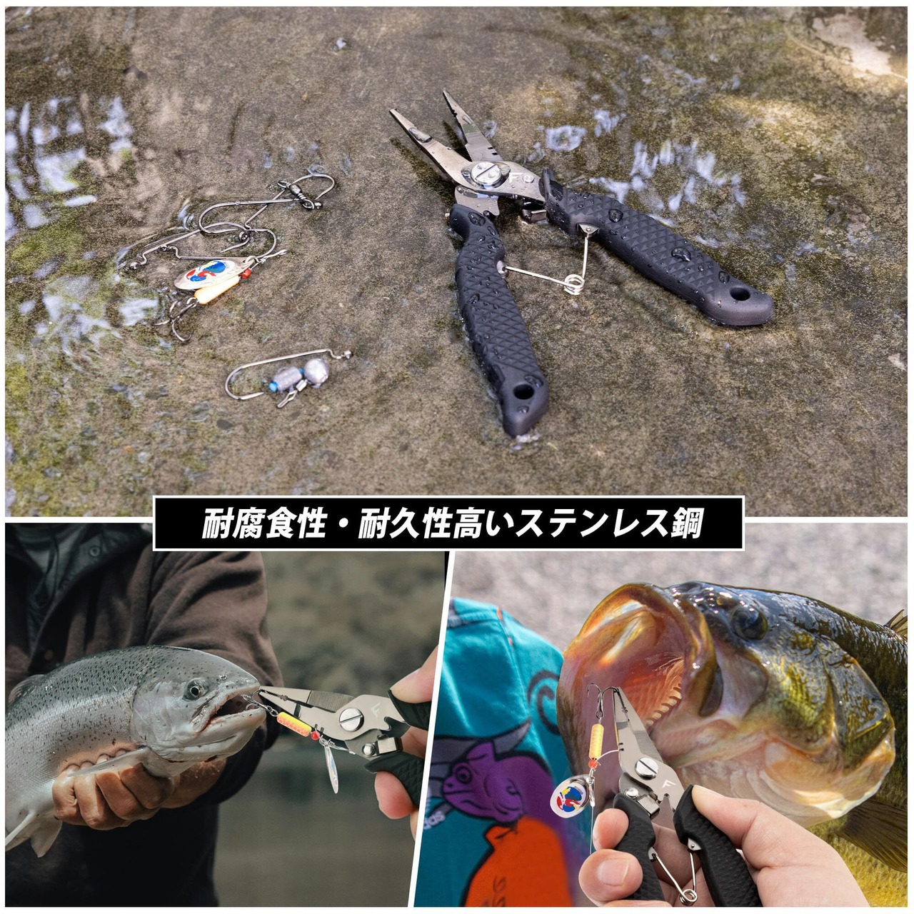 FLISSA フィッシングプライヤー 釣りプライヤー 釣りペンチ スプリットリングプライヤー フックはずし 針外し ラインカッター ロック機構 多機能 防錆