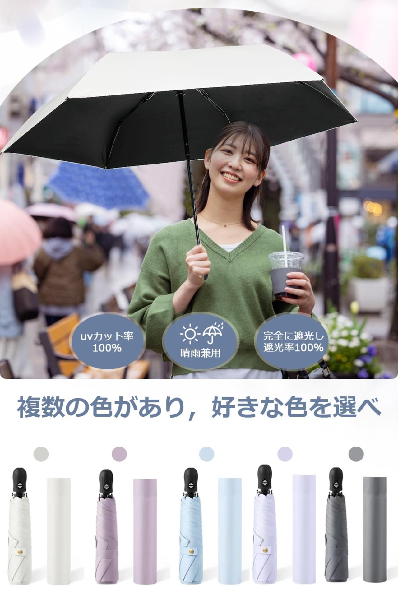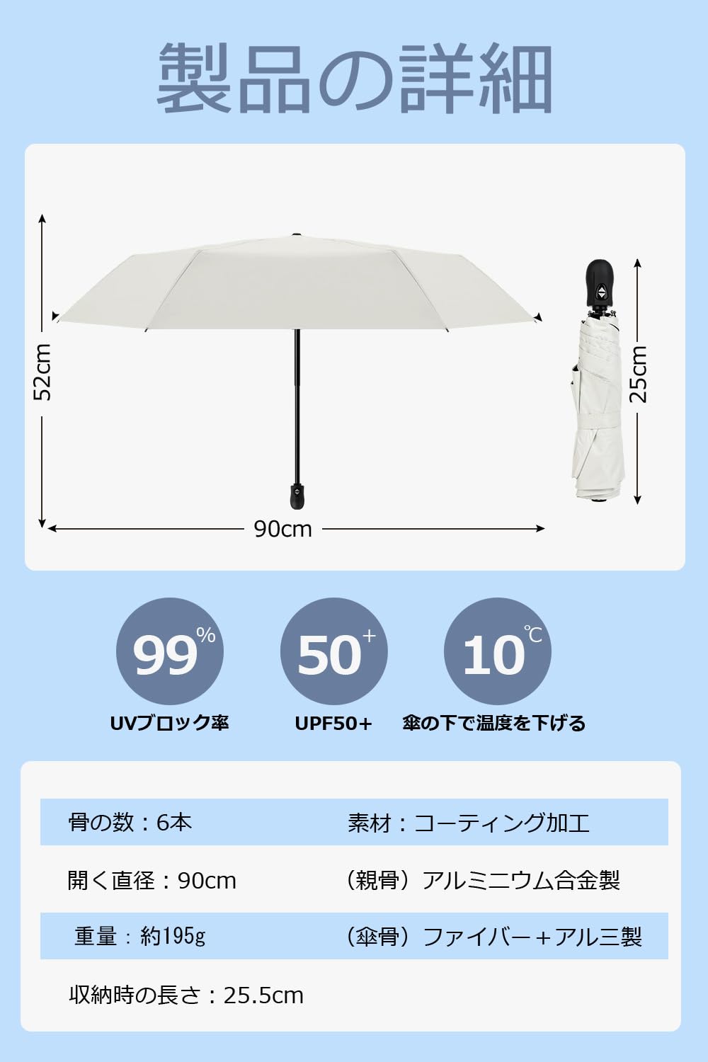 【100% UVカット*UPF50+】高密度傘布と遮光ブラックラバーコーティングを採用。卓越した遮光・遮熱性能を実現。紫外線100%カット・UPF50+基準をクリアし、肌を有害紫外線から保護。