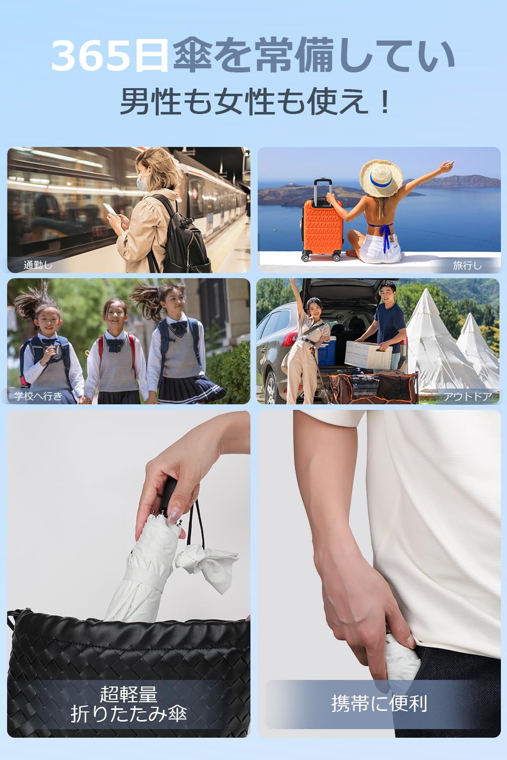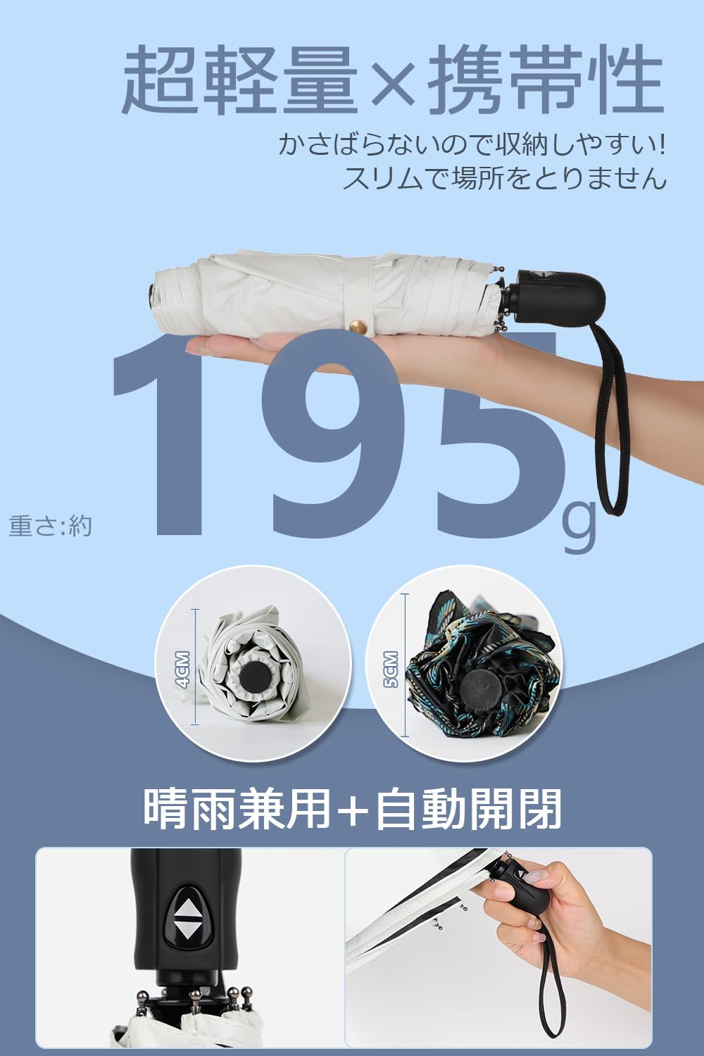 【超軽量折りたたみ*自動開閉】折り畳み時厚さ4cm、長さ25.5cm、重量約195gの超コンパクト設計。鞄にすっきり収納可能な携帯性。男女兼用で全天候型、晴天・雨天を問わず使用可能。ワンタッチ操作の自動開閉機能付きで、片手でも簡単に使用可能。開傘時の抵抗感なし。乗降時でも片手で操作可能な利便性。通勤鞄や車内常備品として、急な天候変化にも即対応。