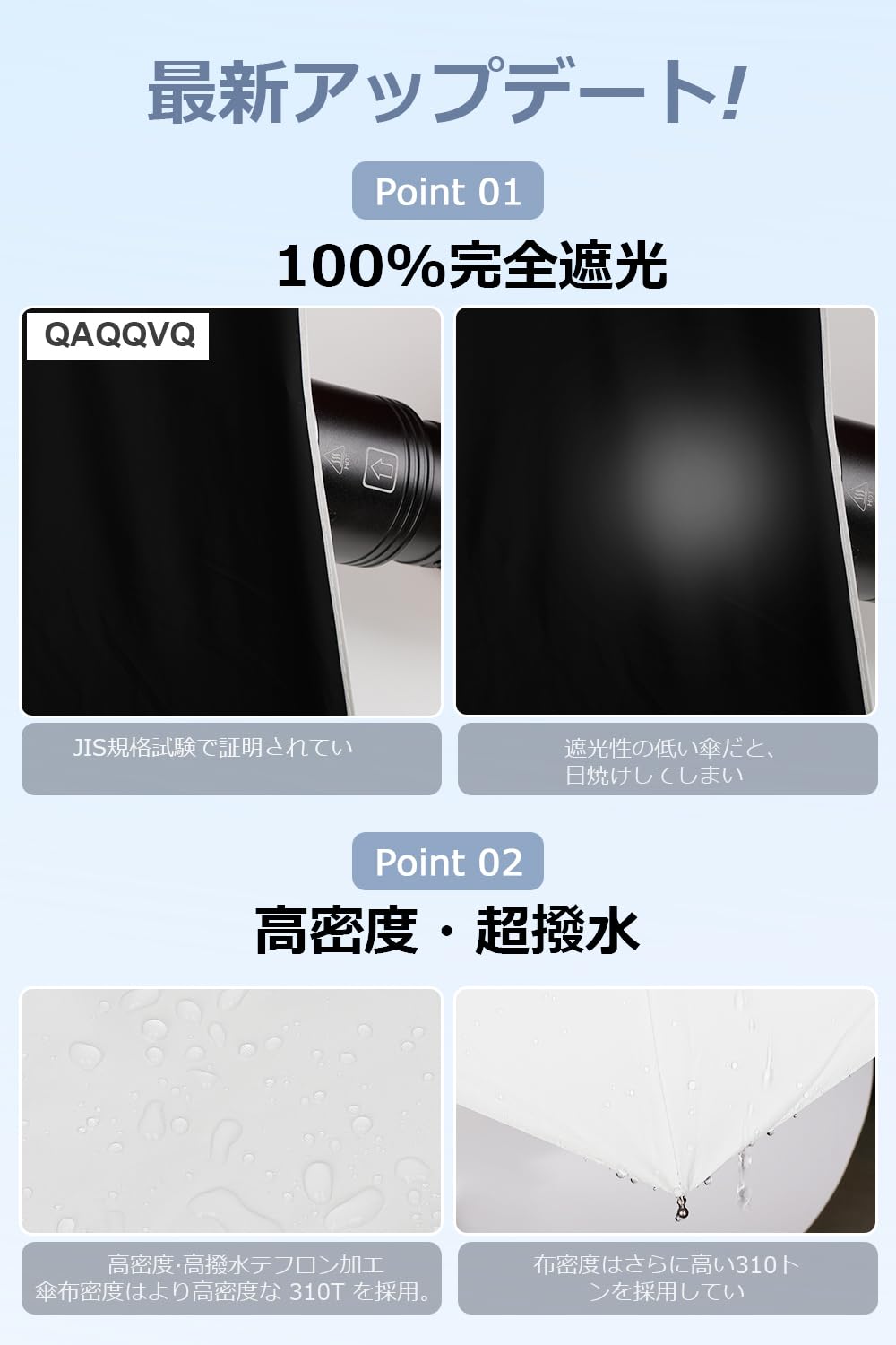 【晴雨兼用*防水防汚】310T高密度防水加工素材使用。通常の傘を上回る防水性を発揮、軽く振るだけで雨水を払い落とせます。防汚加工施済みで汚れが付着しにくい耐汚性素材。