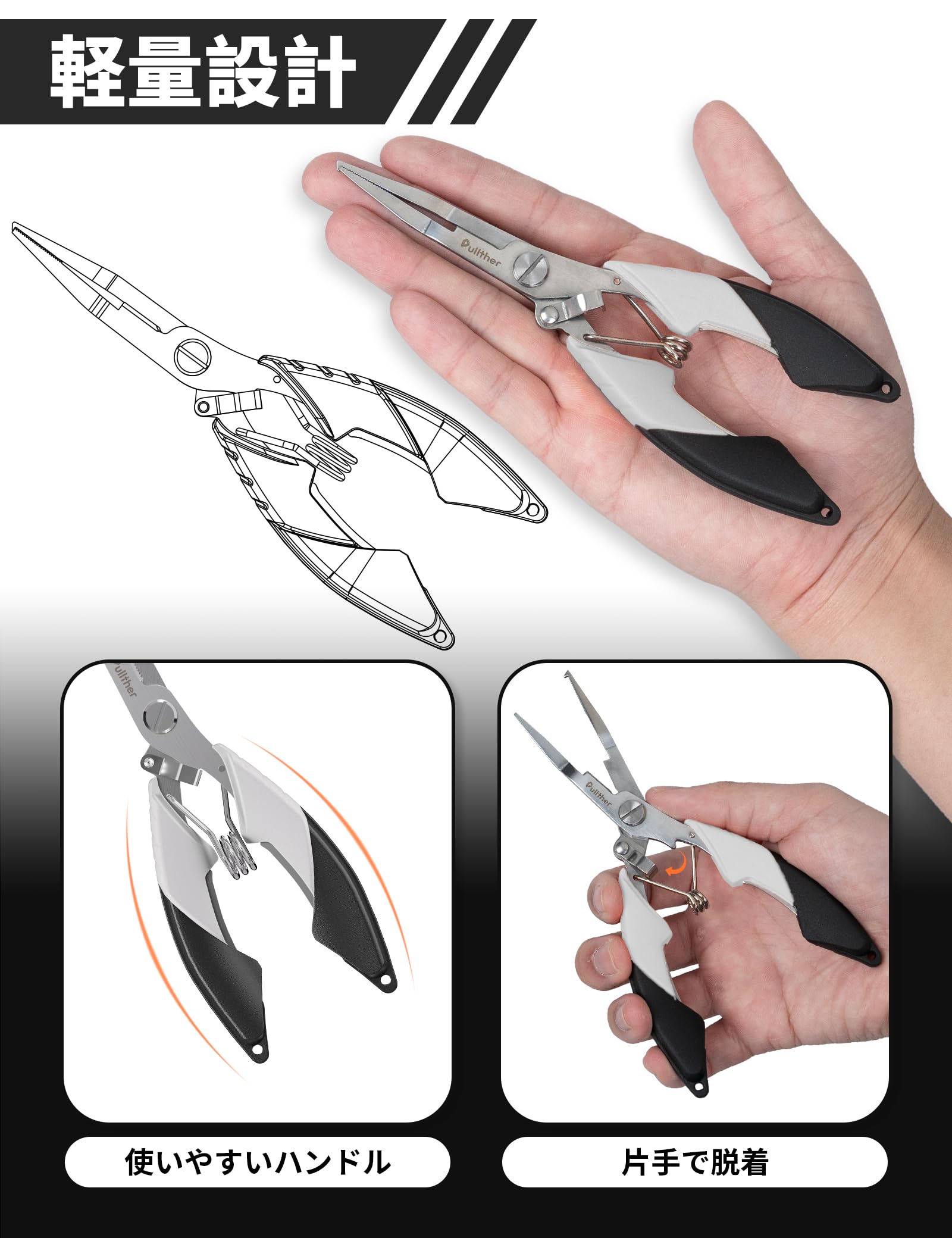 フィッシングプライヤーは片手で開くことができ、サイズ:16.6*5.3cm、手の小さい男性や女性も楽々使えます。ハンドル部は滑り止めの施工で握りやすいです