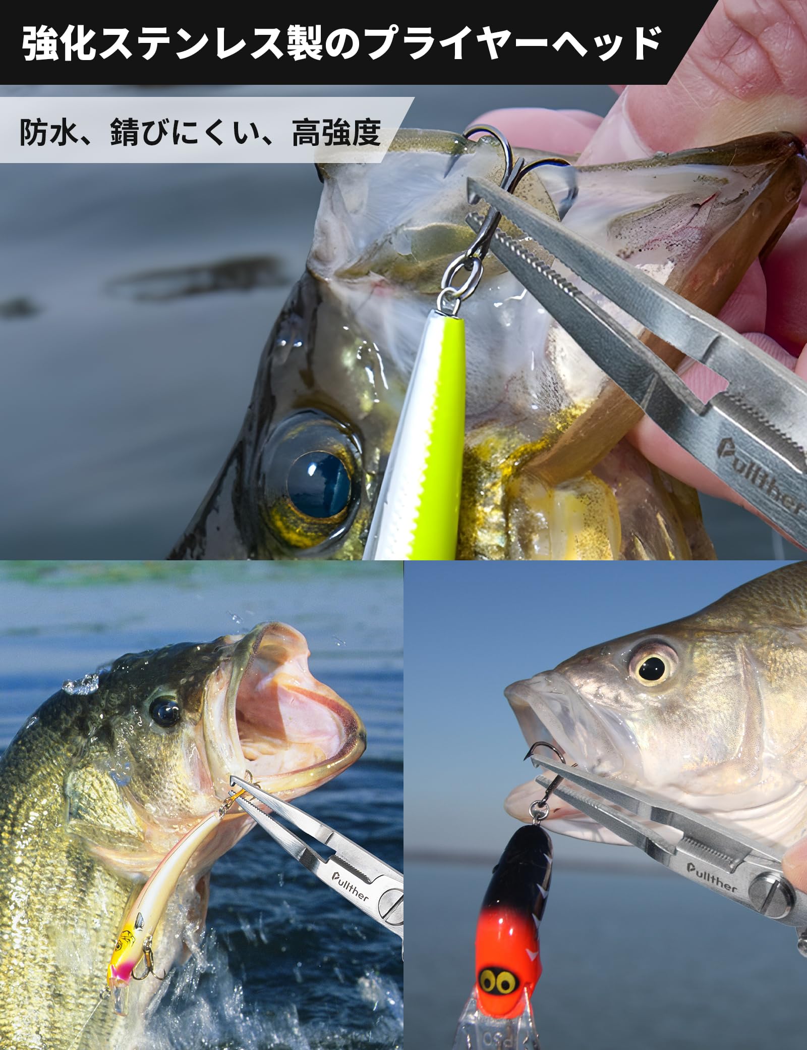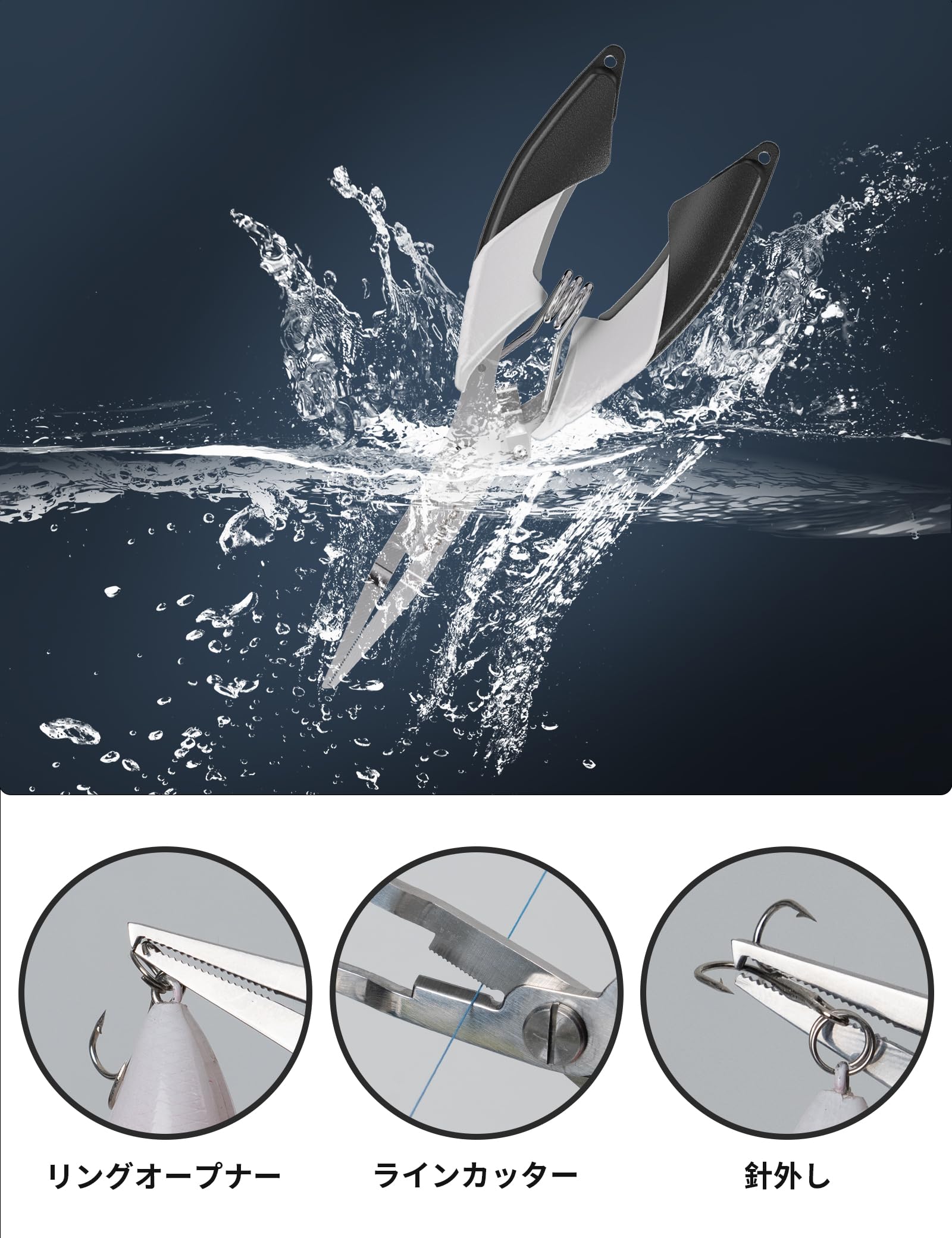 フィッシングプライヤーは高強度ステンレスを使用しており、軽くて、防水で錆びにくいです。使用後、清水で洗って、ドライ環境に置けば、長持ちできます