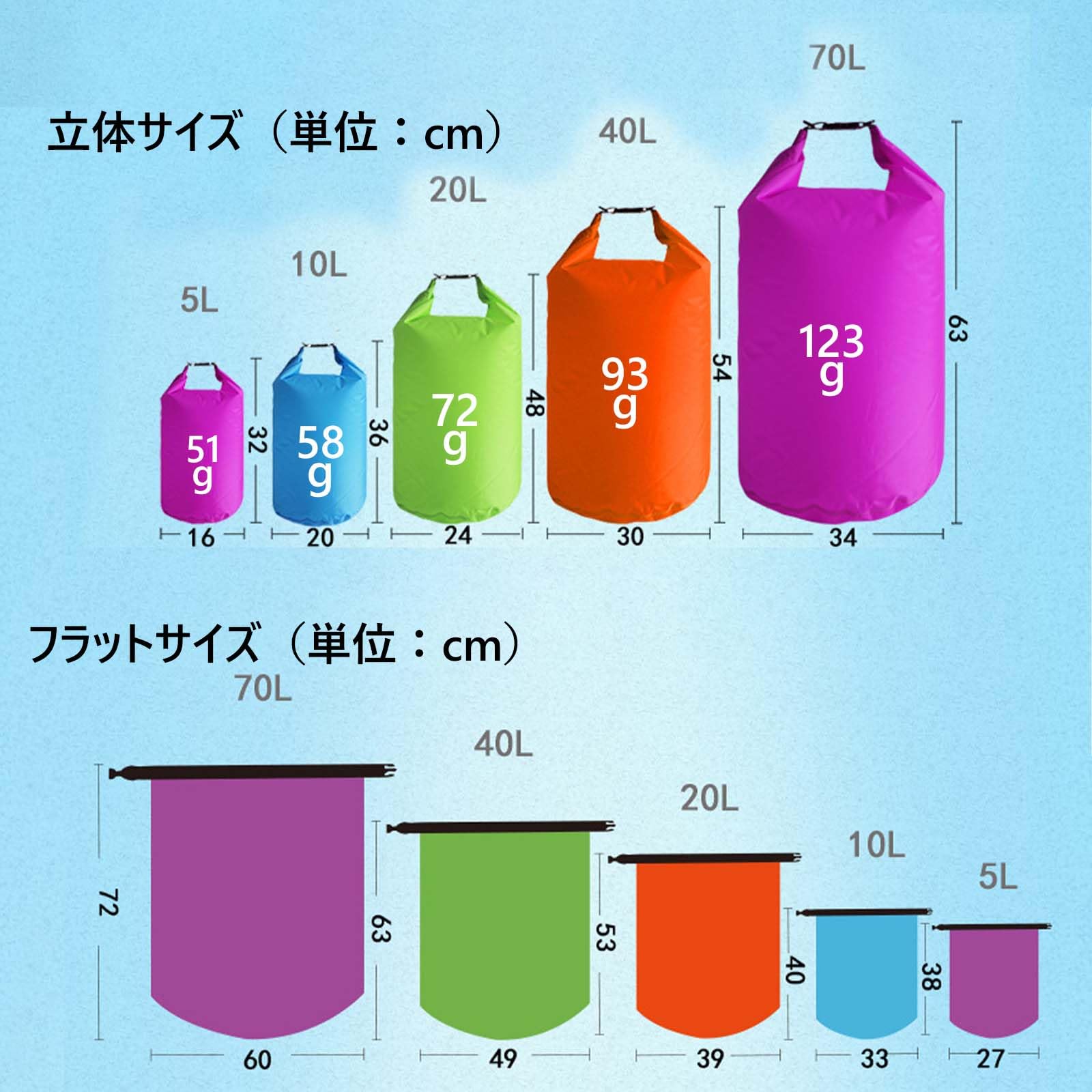 [軽量&コンパクトで長持ち] 防水バッグの内側と外側を乾いた濡れタオルで洗い、乾かしてから完全に自然乾燥させてください。そうすることで、バッグの柔軟性を保ち、長持ちさせることができます。平らなサイズ:5L(高さ:約38cm×奥行:約27cm、約51g)、10L(高さ:約40cm×奥行:約33cm、約58g)、20L(高さ:約53cm×奥行:約39cm、約72g)、40L(高さ:約63cm×奥行:約49cm、約93g)、70L(高さ:約72cm×奥行:約60cm、約123g)[ ]。 注意】素材・構造上、防水性はありますが、100%の防水性をするものではありません。長時間の水没にはご注意ください。