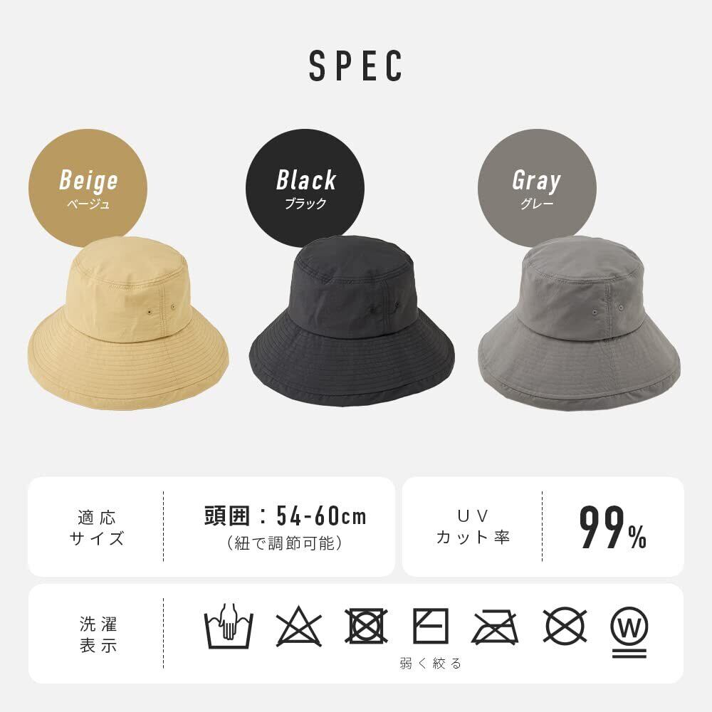 【商品仕様】サイズ/頭囲54~60cm、材質/表生地:ナイロン100%、裏生地(メッシュ部):ポリエステル100%、UVカット率/99%以上、付属品/あご紐
