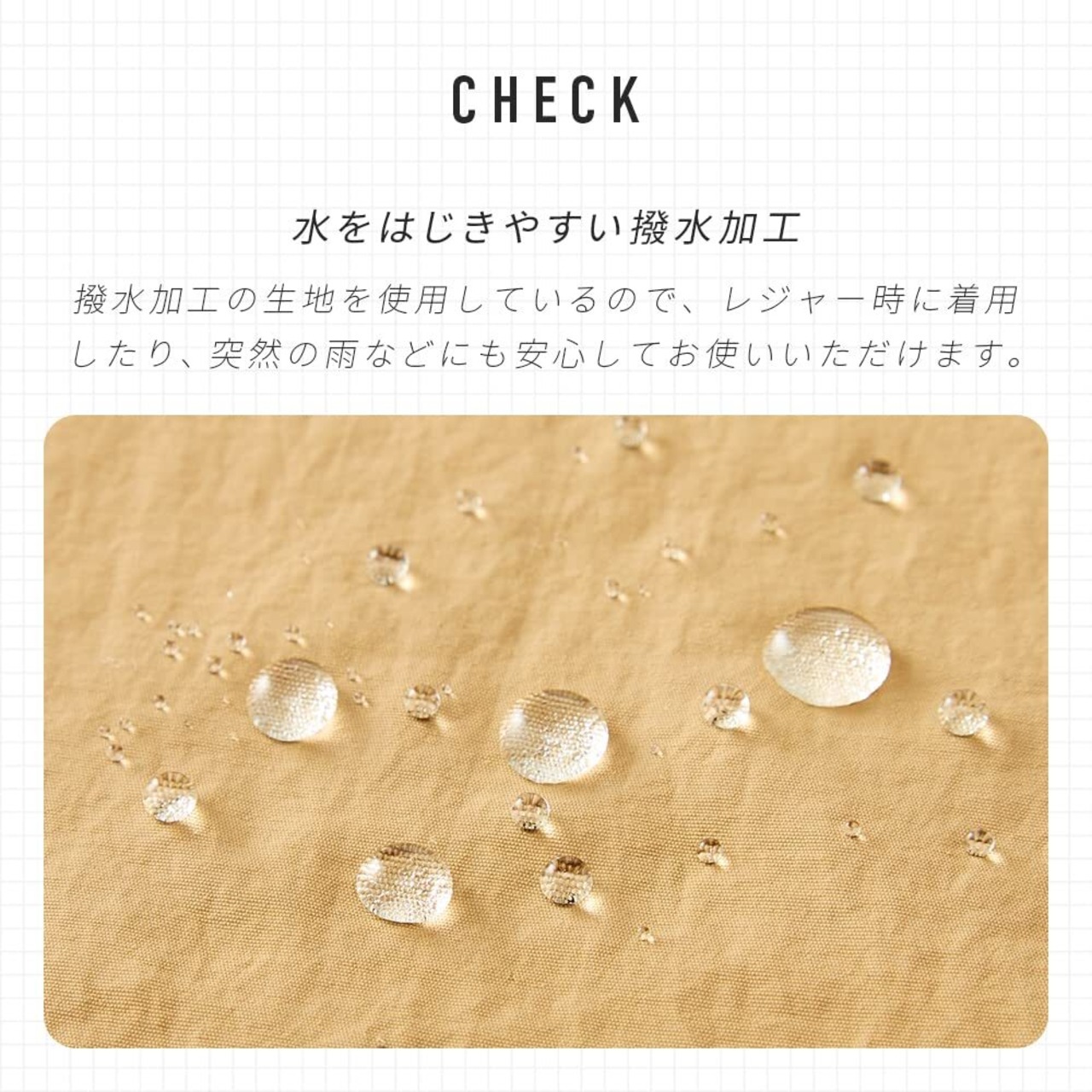 【水をはじきやすい撥水加工】撥水加工の生地を使用しているので、レジャー時に着用したり、突然の雨などにも安心してお使いいただけます。