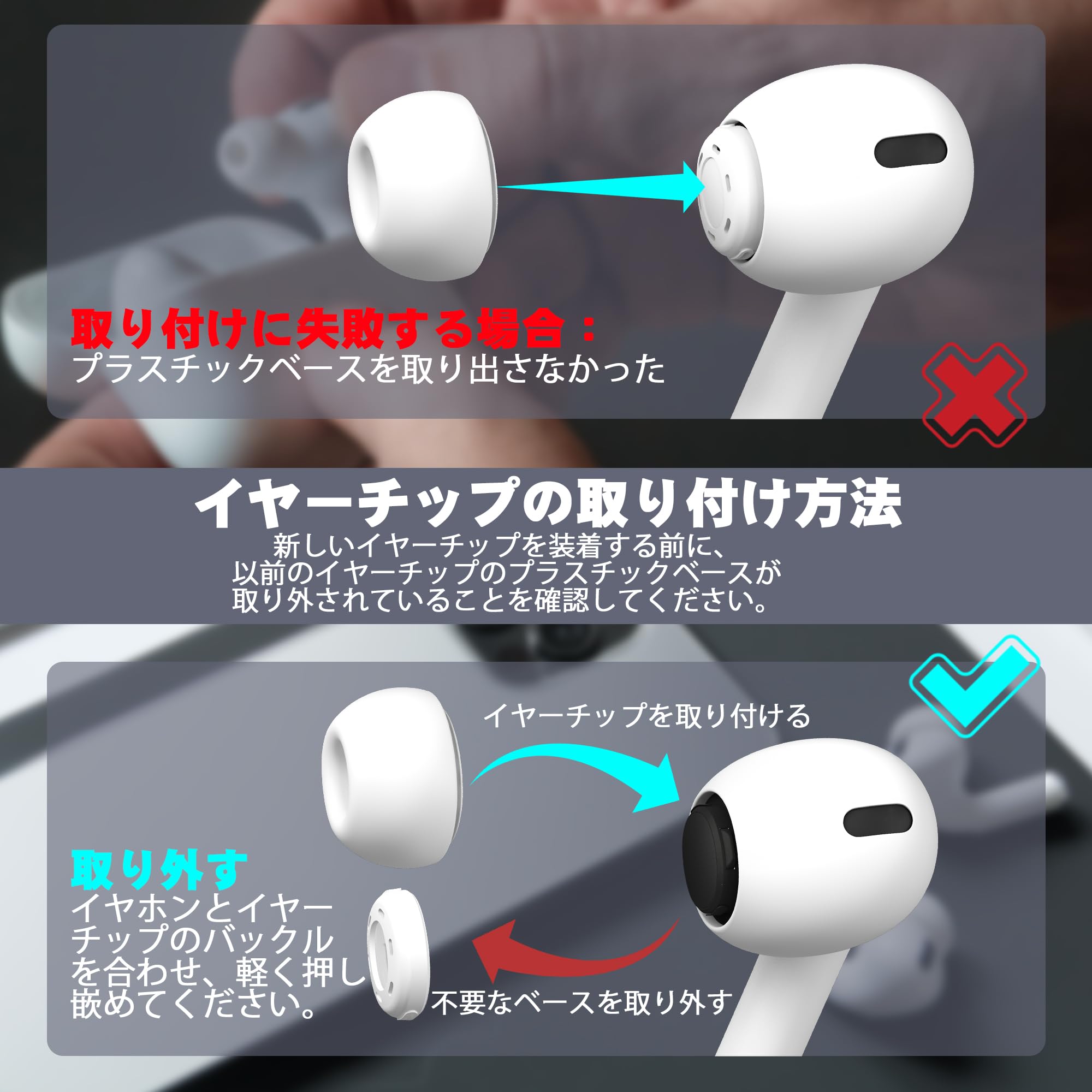 【ご注意】新しいイヤーチップを装着する前に、元のイヤーチップのプラスチックベース (*もしあれば) を取り外してください。