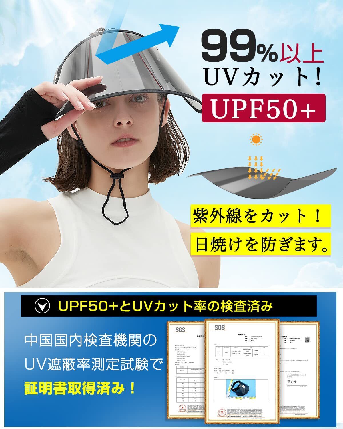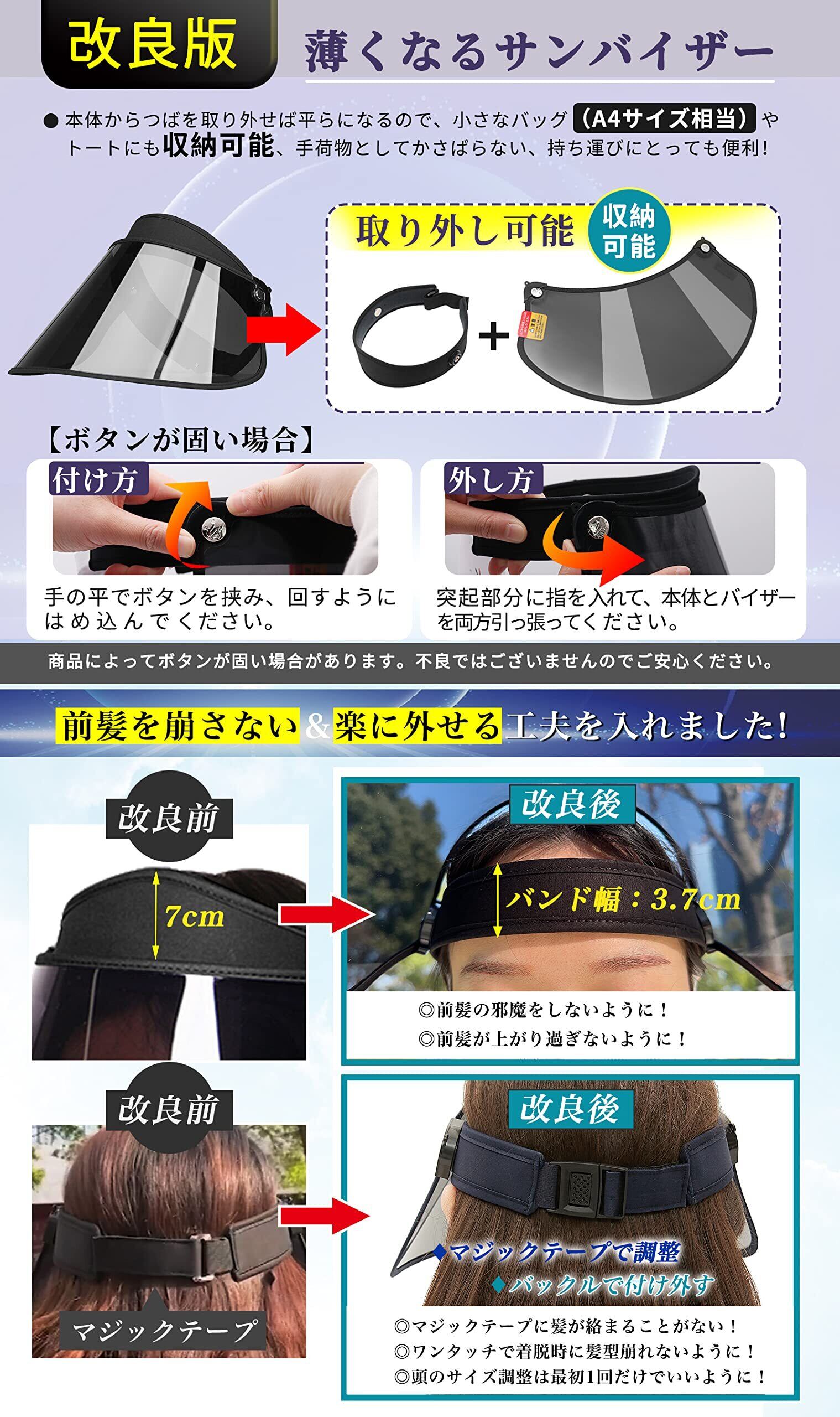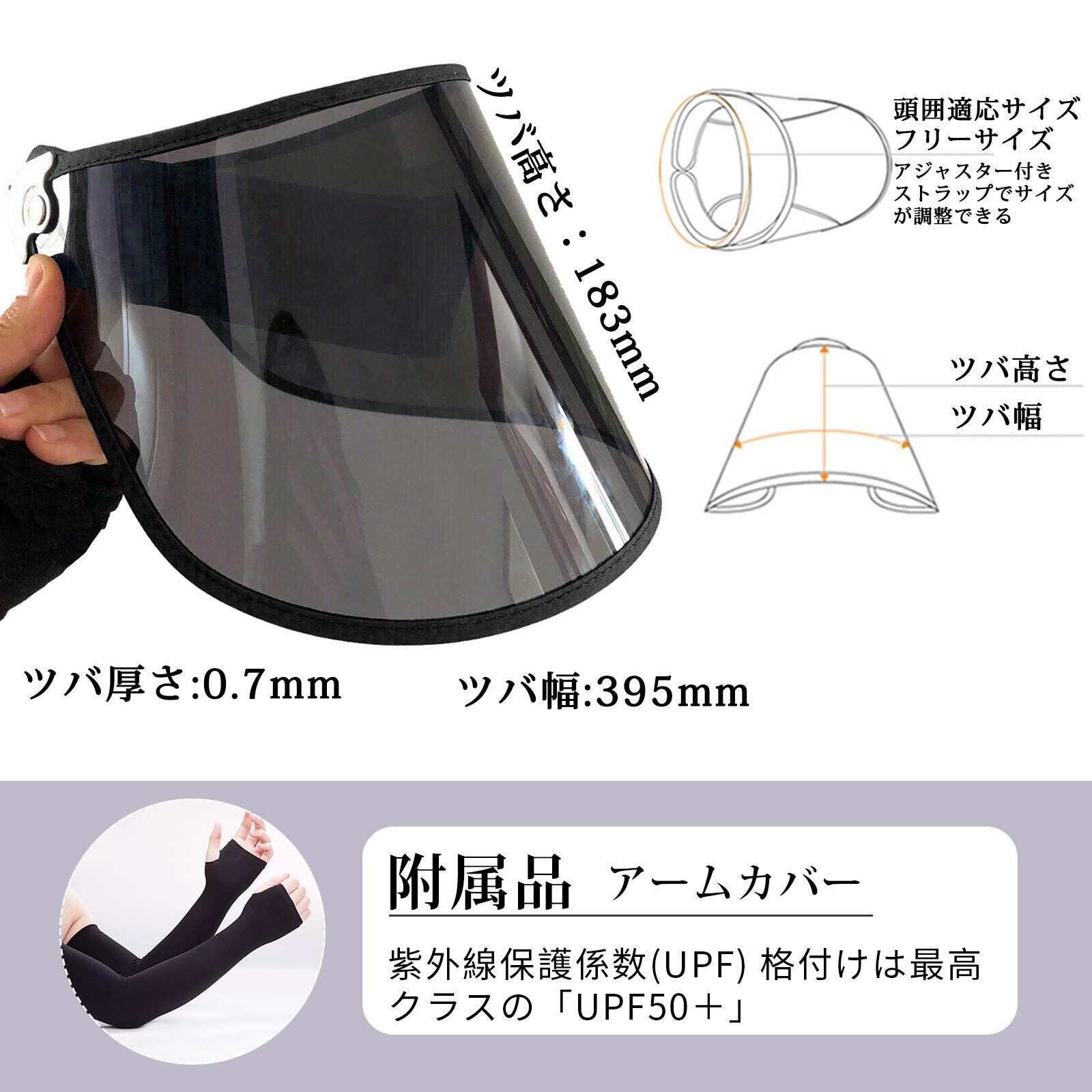 【改良版!!薄くなる UPF50+とUVカット率99%以上】●薄くなるサンバイザー!本体からつばを取り外せば平らになるので、小さなバッグ(A4サイズ相当)やトートにも収納可能、手荷物としてかさばらない、持ち運びにとっても便利!邪魔になってません。 ●肌を傷める紫外線の99%以上(UPF50+)をカット!中国国内検査機関のUV遮蔽率測定試験で証明済み。紫外線からお肌を守り、日焼けを防止するシールドは、しみ・ソバカス・シワ予防に!ちょっと外に出る時にノーメイクでも安心! ●附属品:アームカバー キシリトールと気化熱の働きでヒンヤリのアームカバーは、水や汗で濡れると気化熱の作用により冷却効果があります。