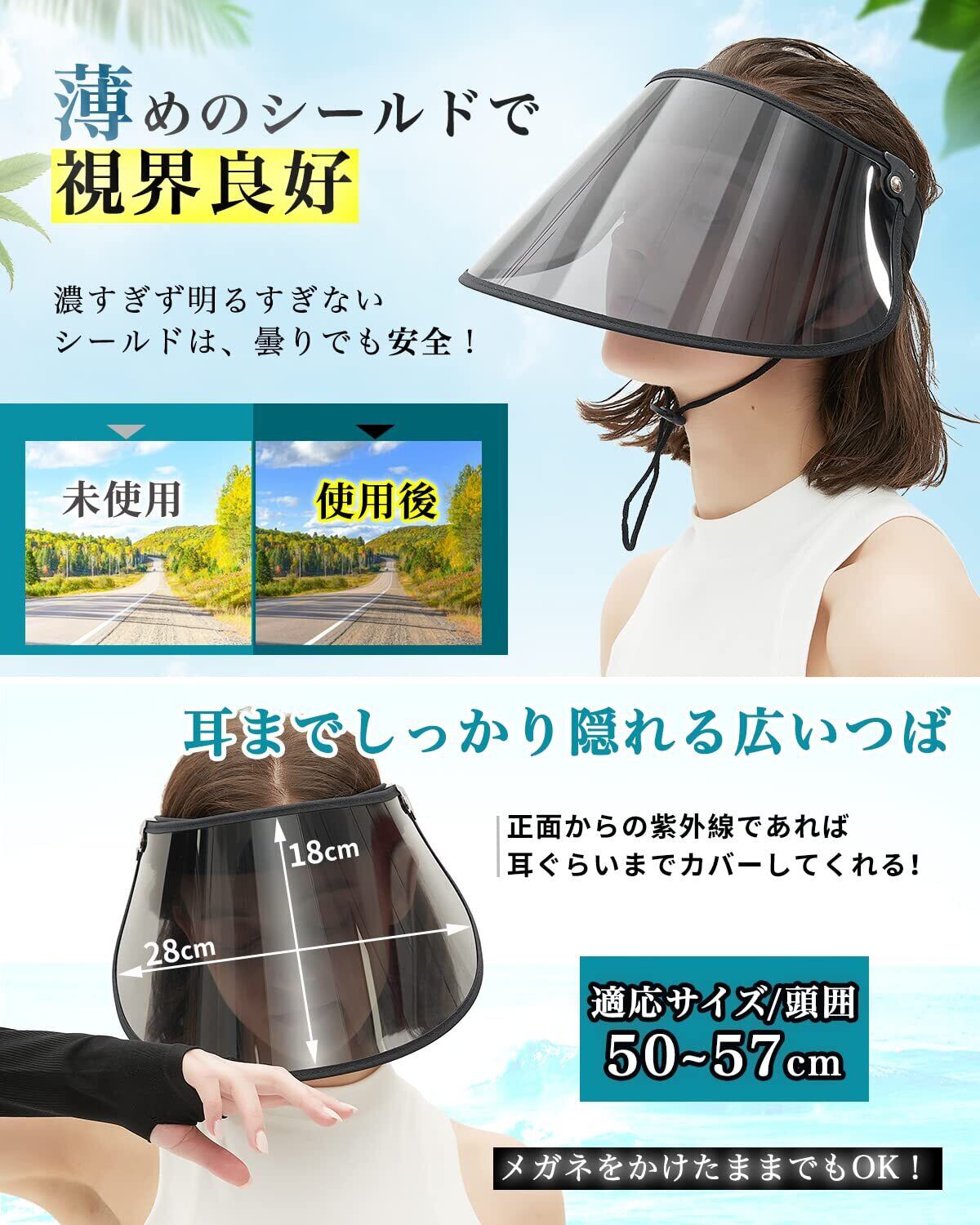 【薄めのシールドで視界良好】●つばのサイズ:高さ18cm/幅(弧長)39.5cm/ツバ厚さ0.7mm ●適応サイズ:頭囲約50~60.5cm ●付属品:あご紐*1、アームカバー*1、レンズ清潔用クロス*1,前が見えづらくならないよう、濃すぎず明るすぎないシールドは、曇りでも視界良好!通勤やお出かけなど、雨で化粧を崩したくない人に最適。雨・風・冷気・虫をシャットアウト! 帽子で日除けをすると、当製品は頭も蒸れずにスッキリ快適です。冬の紫外線、寒さ避けにもなります。