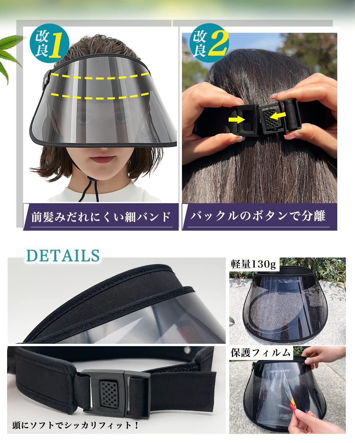 【バイザー角度階段調整付き】視界をさえぎらずにつば広タイプで顔全体を覆い紫外線をカット!耳までしっかり隠れるワイドタイプ、蒸れない、通気性が良いサンバイザーです。風通しがよいので汗をかき辛く化粧崩れもし難いです。階段調整付きで片手で上げ下げます。 安価な製品では綺麗に剥がせないとの声が多い保護シールですが、当製品はシールが簡単にキレイにはがせます。 付属の首ひもは取り外し可能で、長さも調節できます。自転車で風が吹いてもつばの角度をしっかりサンバイザーです。
