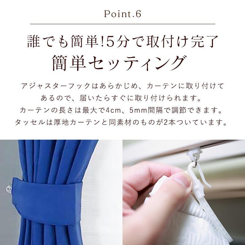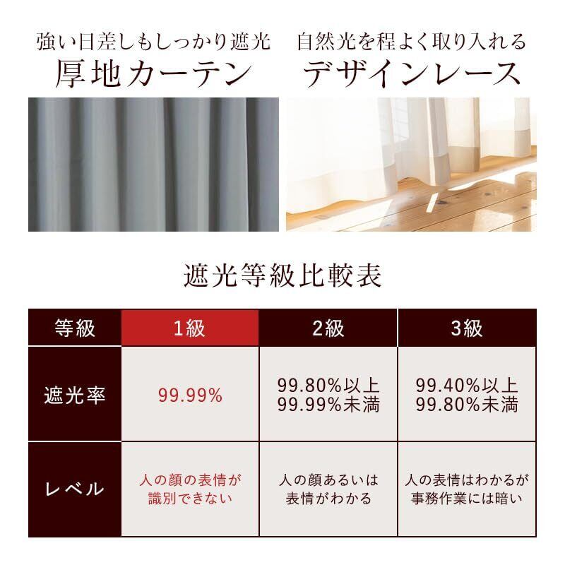 ・選べる6色8サイズ、お部屋にもコーディネートしやすい無地の厚地カーテン+白のレースカーテンの4枚セット。1級遮光、遮熱、形状記憶加工、ウォッシャブルなど機能豊富でオールシーズン省エネでエコ。新生活やお引越しにも最適。・【遮光】1級遮光(遮光率99.99%)の性能。人の顔の表情が識別できないレベル。・【遮熱】通常のカーテンよりも窓から入る熱を防ぎ、室内温度の上昇を抑える効果で快適な空間に。・【形状安定加工】きれいなウェーブを保ち窓回りがすっきりと美しく。・【カラー】ピンク・グリーン・ネイビー・アイボリー・ブラウン・グレー【サイズ】100×110cm・100×135cm・100×150cm・100×178cm・100×190cm・100×200cm・100×210cm・100×220cm