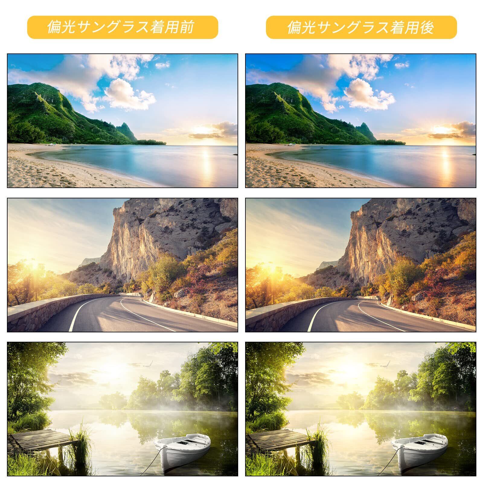 【UV400】高効率のフィルター層は、紫外線 (UVA、UAB、UVC) を100%カットし、あらゆる屈折散乱光を排除し、シーンをソフトに見せながらまぶしくなく、視界はよりクリアで、効果的に目を保護します。