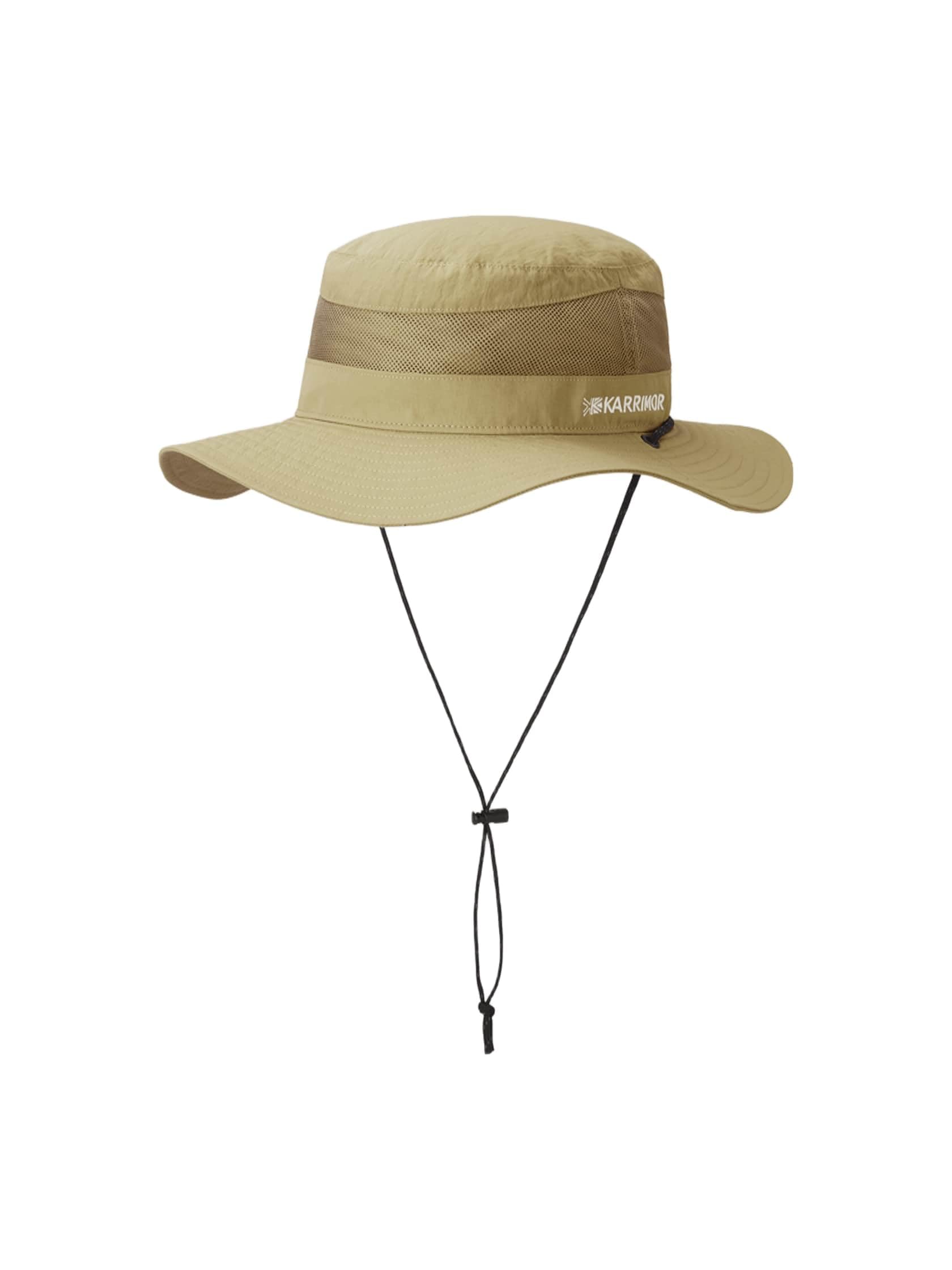 はっ水性とUVカット性に優れた生地(UPF50⁺)を使用した、カリマーの定番ハット。本体側面には通気性を重視してメッシュ素材を配置。頭周りには吸水速乾機能を持ち、抗菌防臭加工(SEK認証)した汗止めテープを使用。ドローコードでサイズ調整可能。あご紐付き。