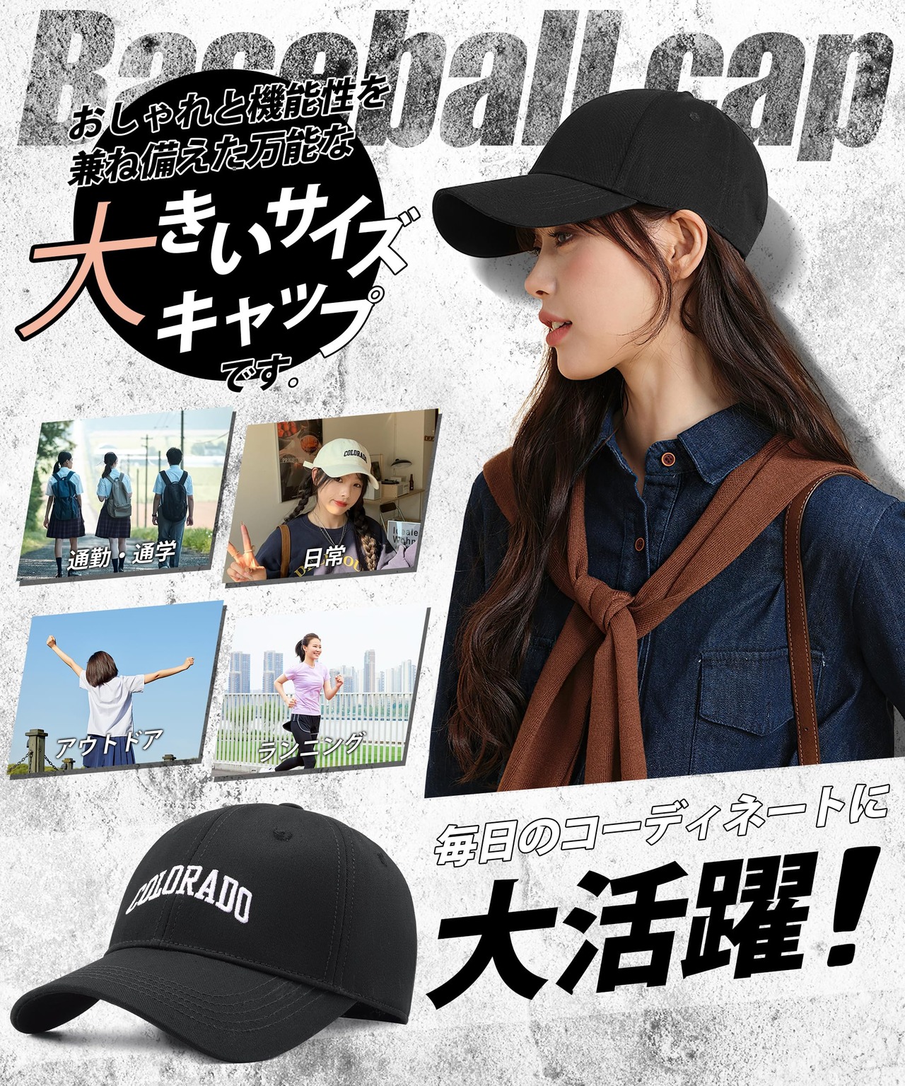 【大きいサイズのキャップ】頭の大きい方に向きご用意した大きいサイズキャップです。頭周りは56-62cmであり、調整可能なので。つばの長さ約7.5cm、深さ約12cm。髪を巻いたときや、締め付け感なく被りたい時など、自分好みのサイズ感で被ることができます。日本人の頭がた型にフィットし、キャップが初めてのかたにも安心してご使用いただけます。