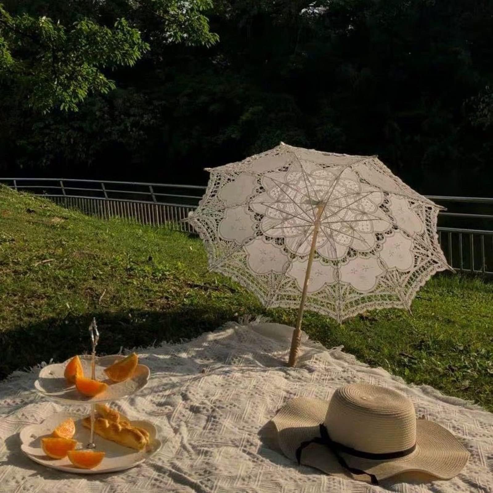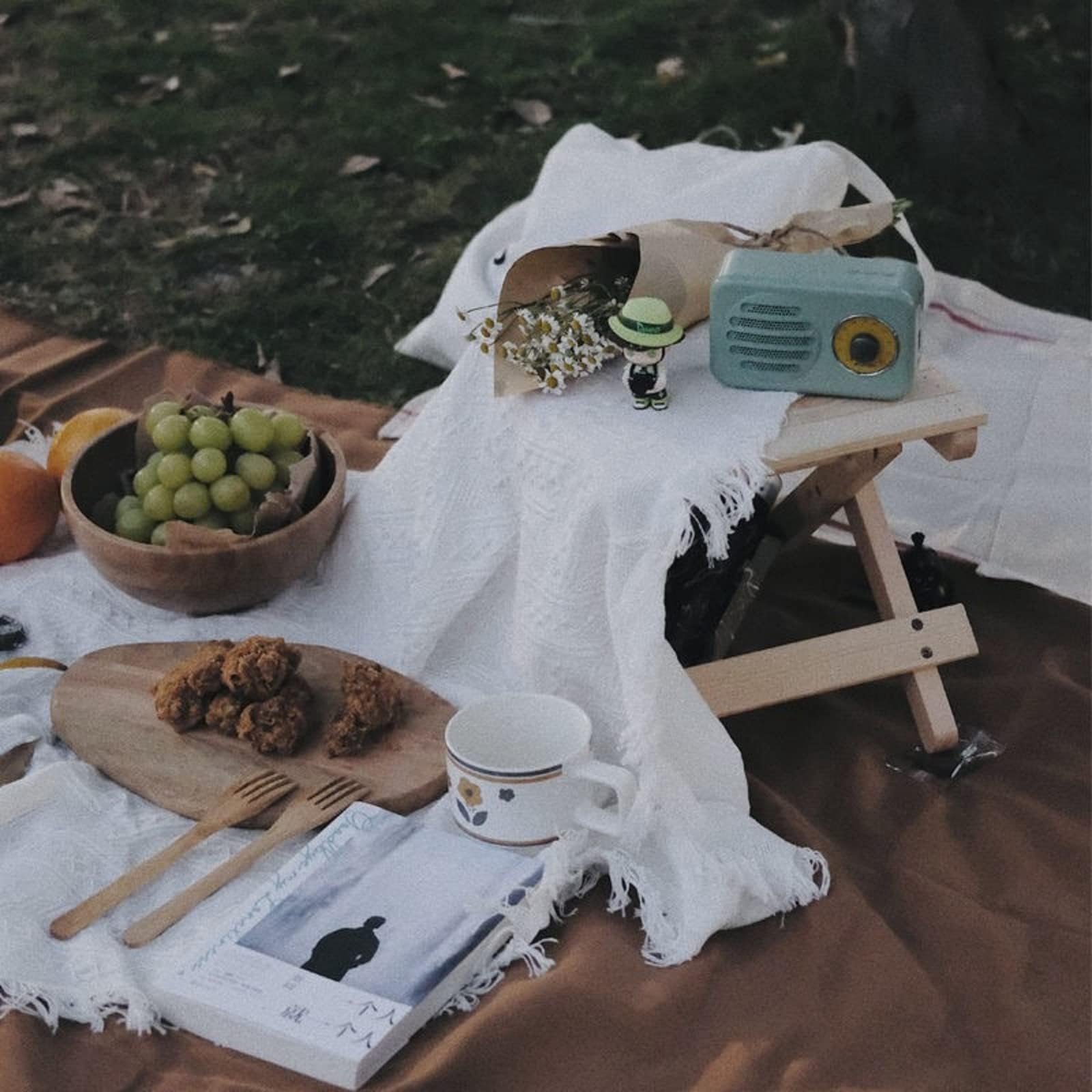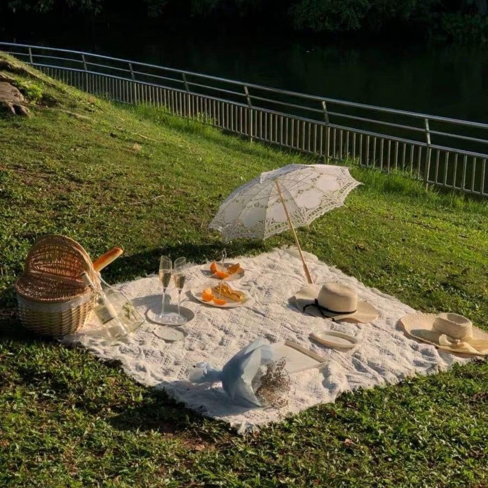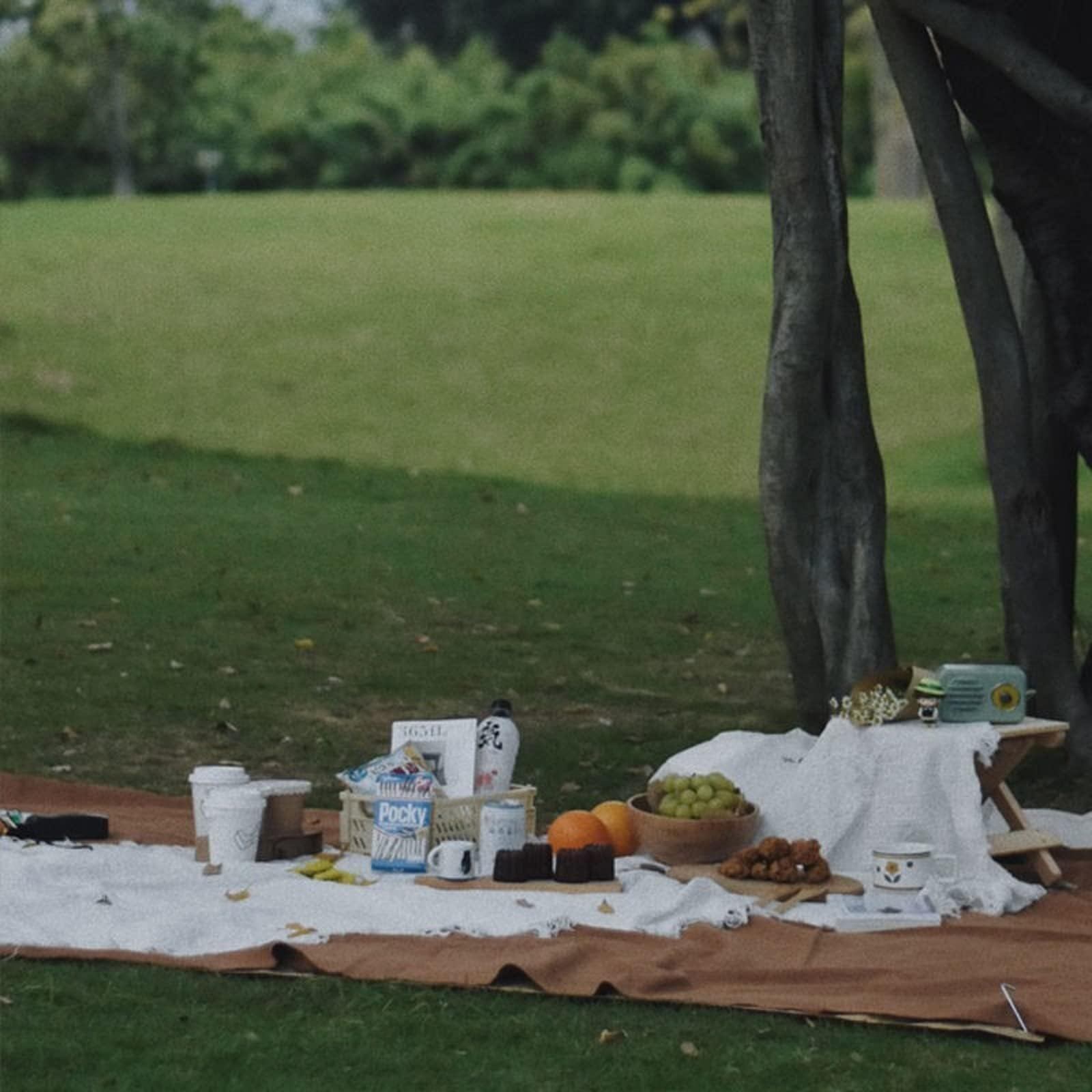 【インスタ映え】思いっきりインテリアのレースの布ですが、実はレジャーシートのワンポイントとして大活躍します。普通のレジャーシートよりもファンシーなので、海外のピクニックみたいな画が撮れます。