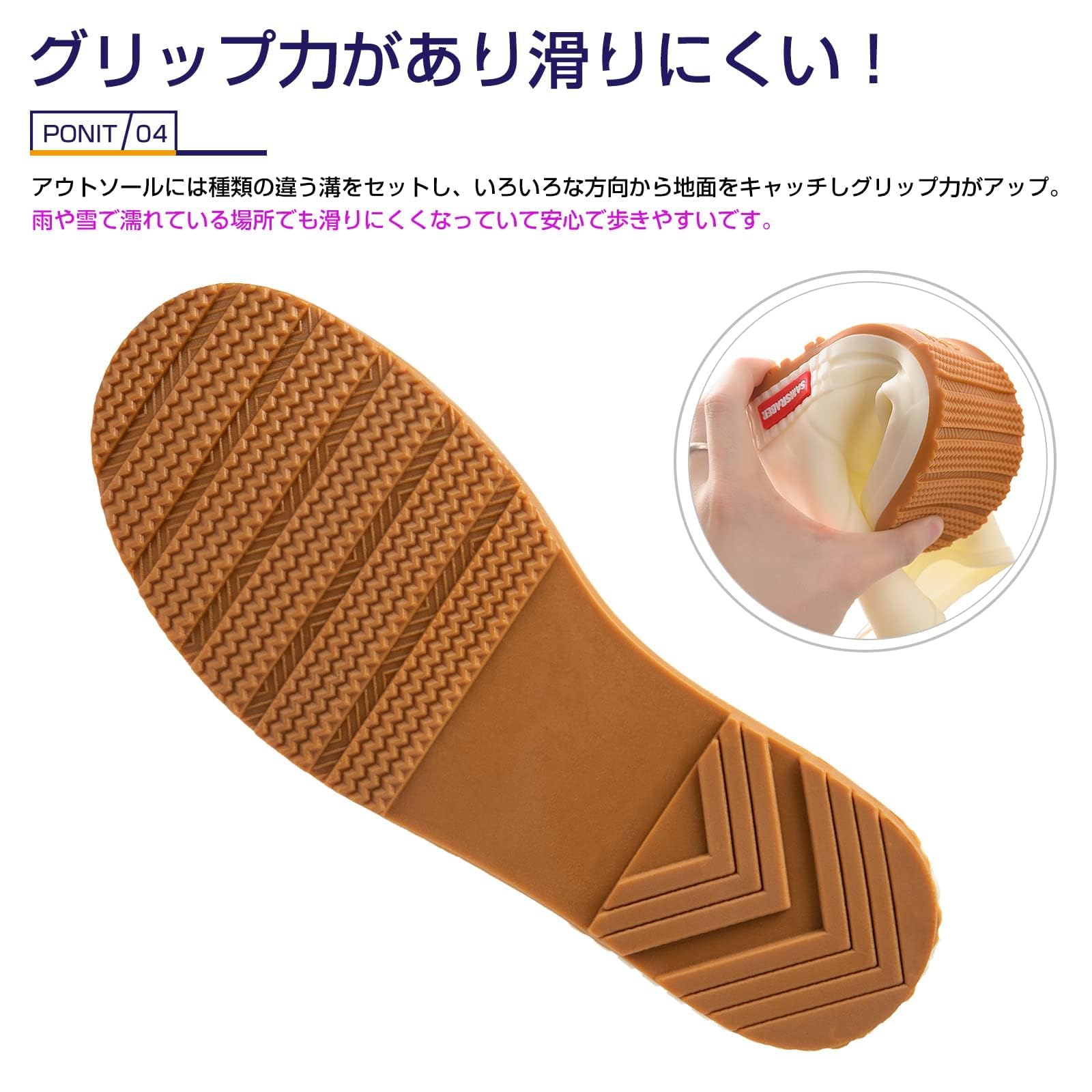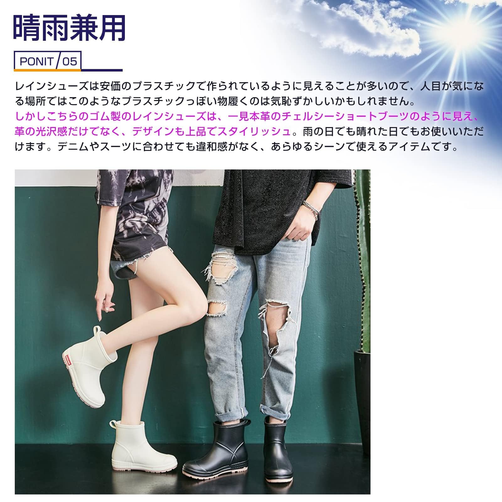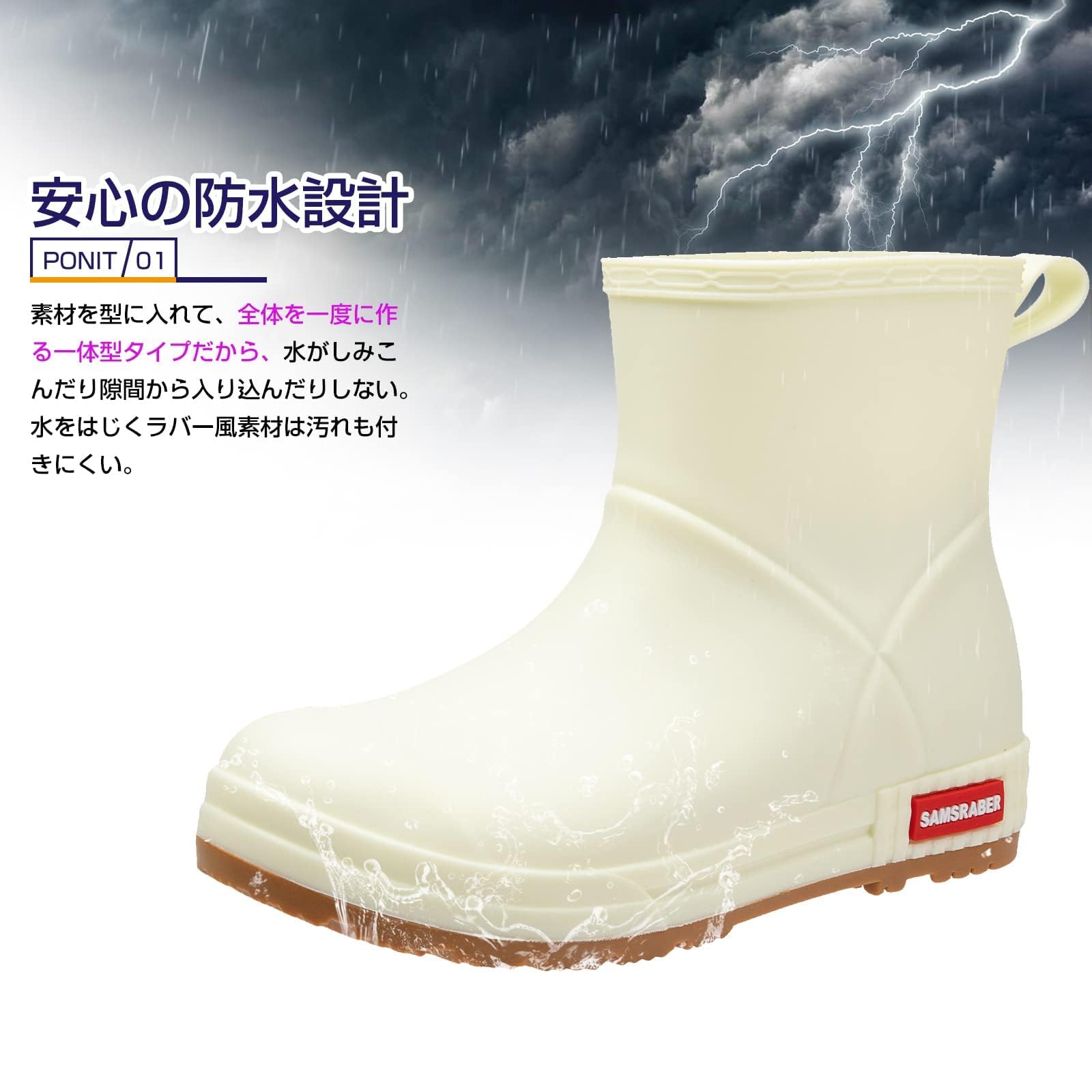 【防水素材 晴雨兼用】急な雨が多い季節に大活躍の1足です。素材を型に入れて、全体を一度に作る一体型タイプだから、水がしみこんだり隙間から入り込んだりしない。水をはじくラバー風素材は汚れも付きにくい。