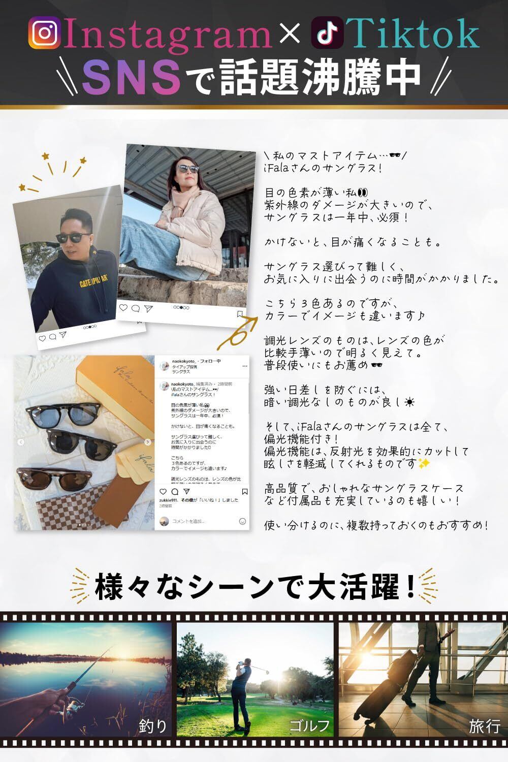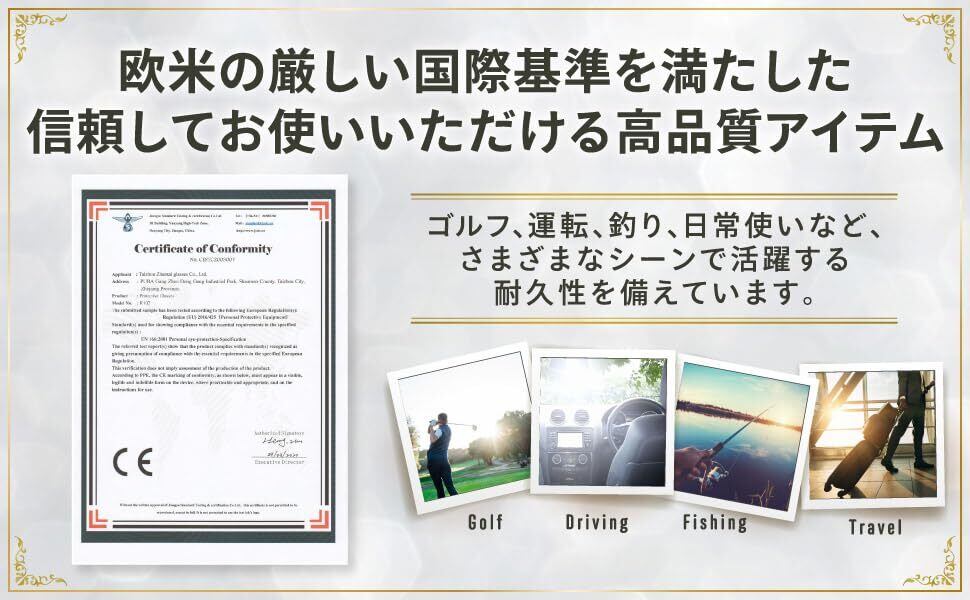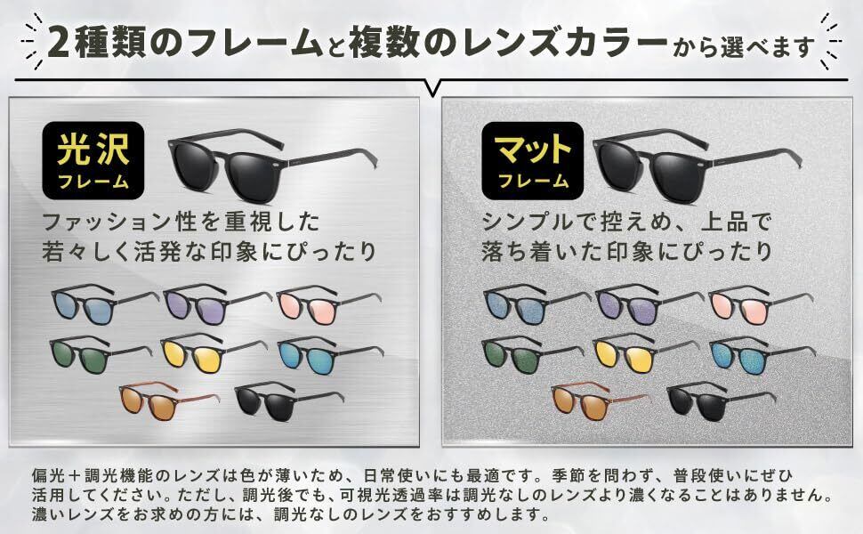 【最新型・調光×偏光サングラス】最新型の偏光・調光サングラスは、2つの機能を備えたレンズにより、乱反射を抑えつつ、目を保護しながら明るくクリアな視界を提供します。1本で屋内外どちらでも快適です!薄めのカラーで日常使いにも最適。夏のアウトドア、秋の紅葉散策、冬のスキー、春の花見はもちろん、お釣り、ゴルフ、日常のウォーキングやドライブなど、季節を問わず幅広いシーンで活躍します。 ※調光後でもレンズが濃くなりすぎることはありません。濃い色をご希望の方には調光なしタイプをおすすめします。