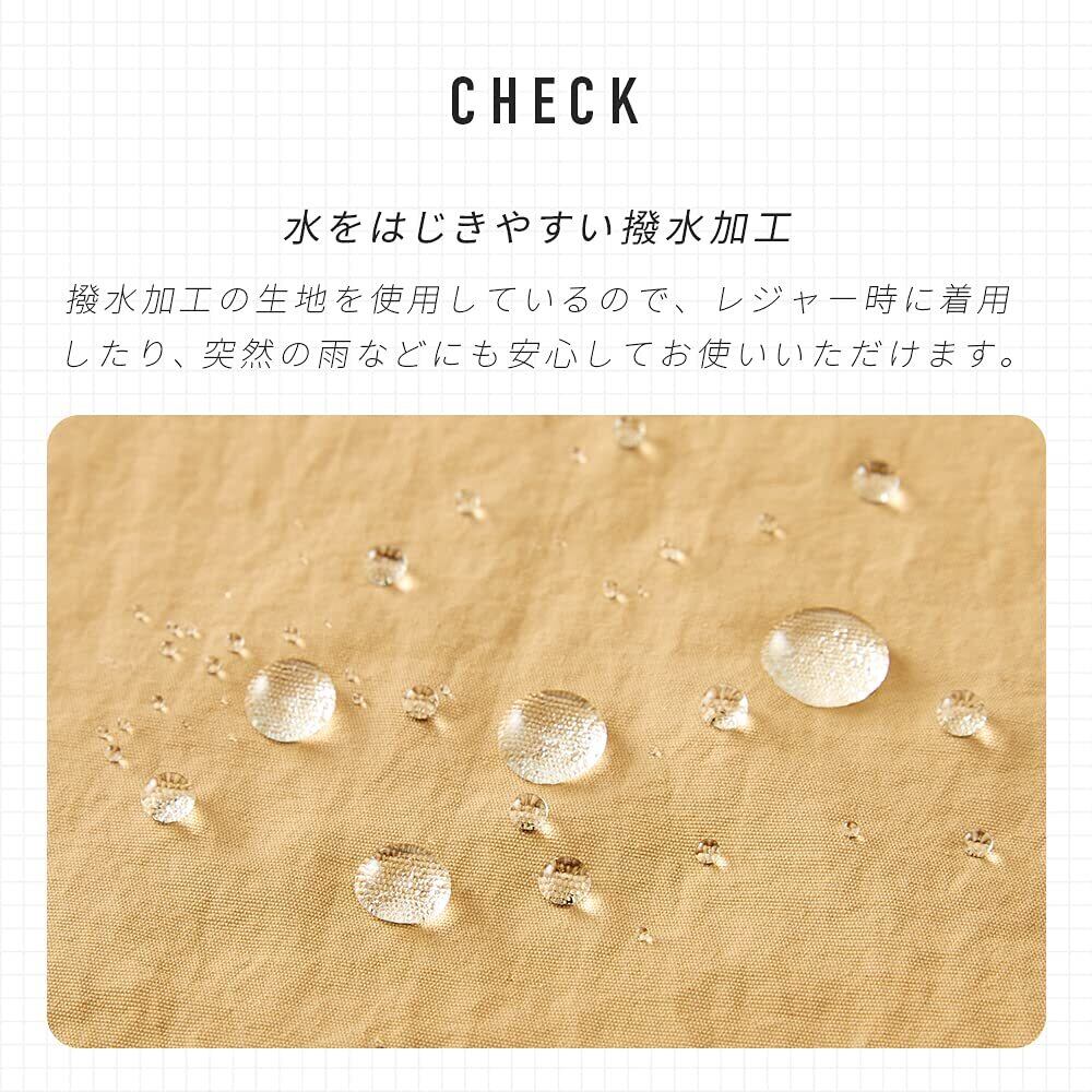 【水をはじきやすい撥水加工】撥水加工の生地を使用しているので、レジャー時に着用したり、突然の雨などにも安心してお使いいただけます。