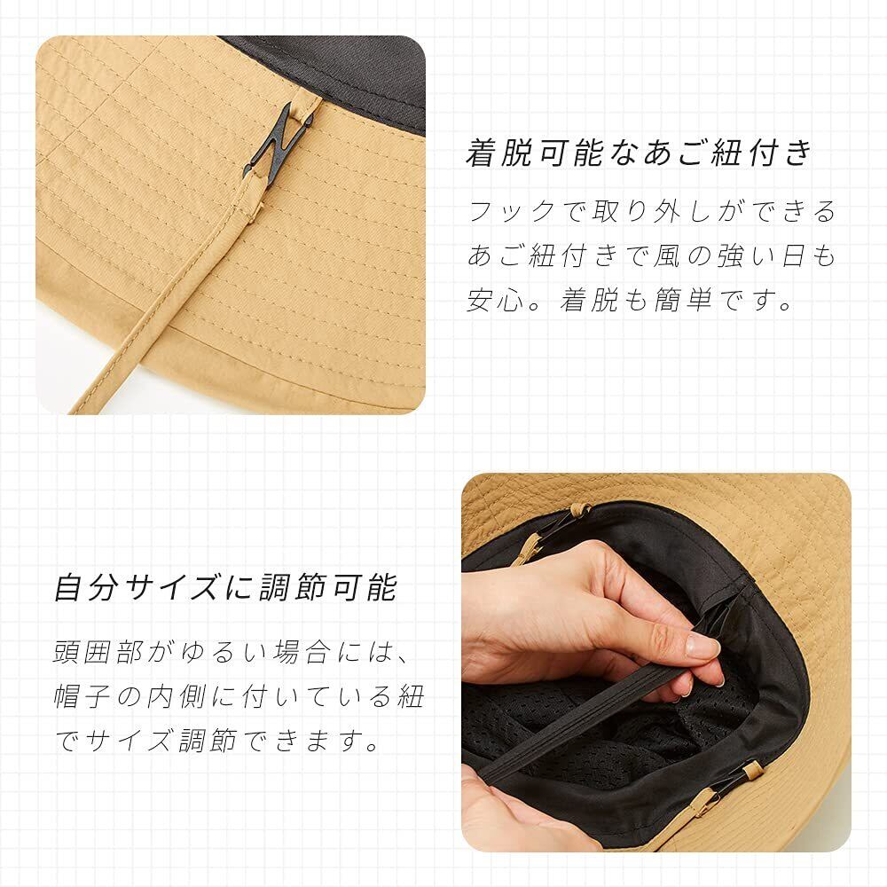 【自分サイズに調節可能】頭囲部がゆるい場合には、帽子の内側に付いている紐でサイズ調節可能。また、フックで取り外しができるあご紐付きで風の強い日も安心。着脱も簡単です。