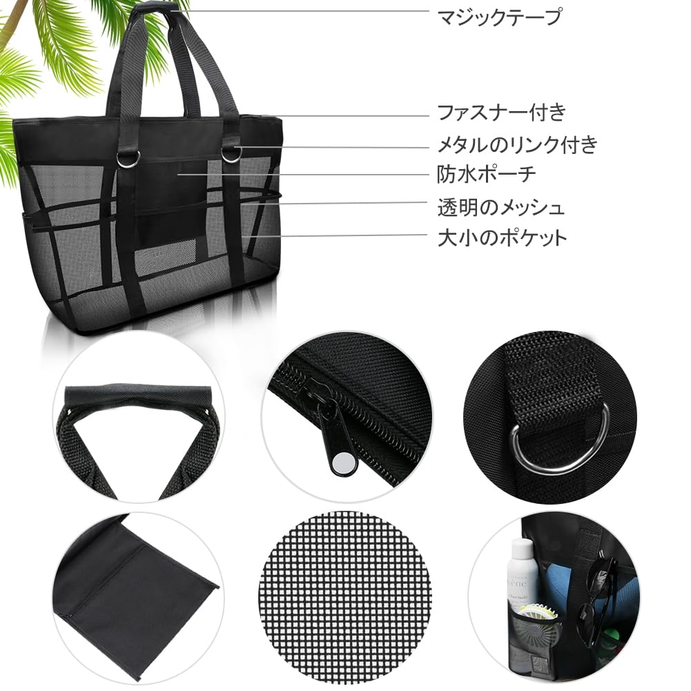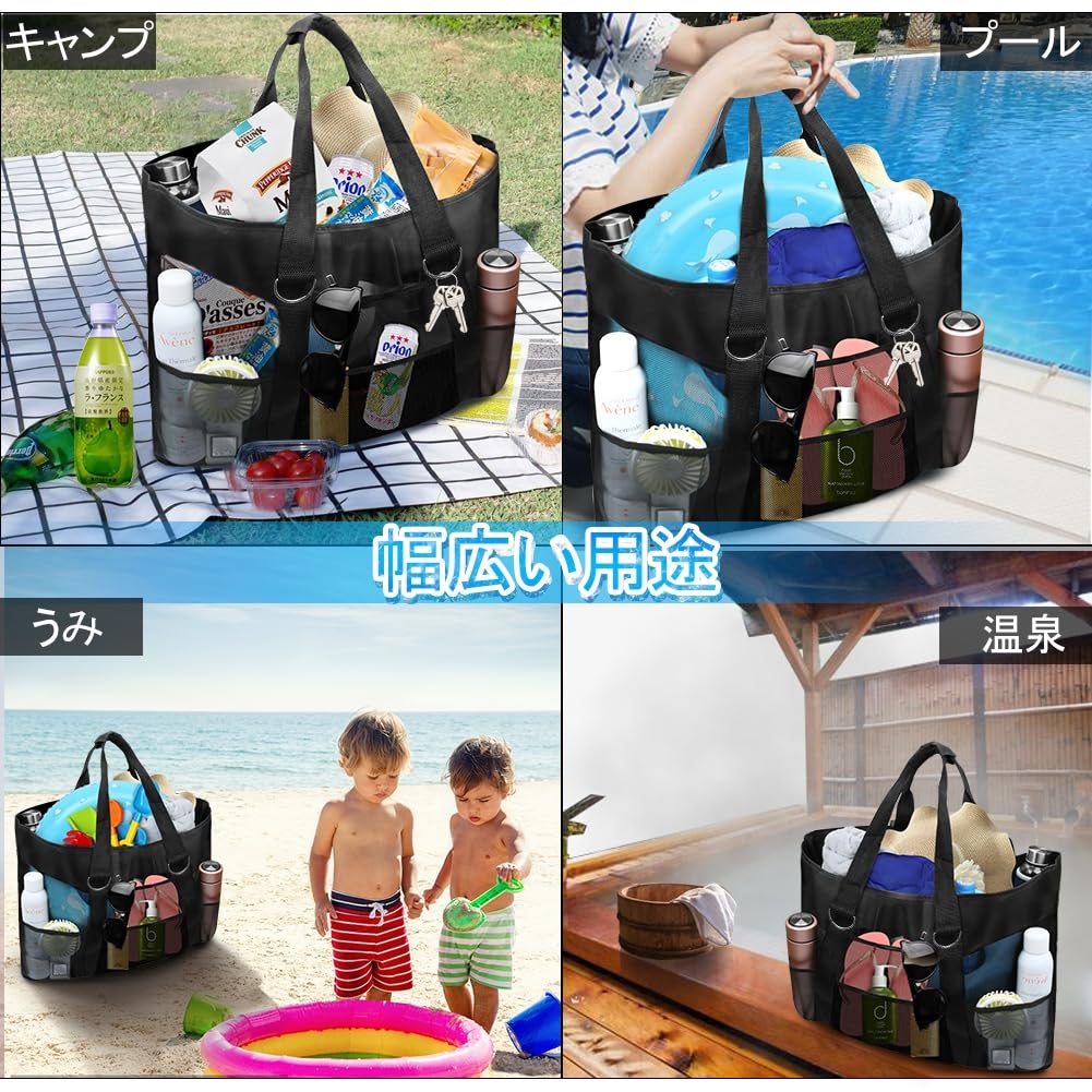 CANPEKI ビーチバッグ プールバッグ 軽量 大容量 メッシュバッグ ビーチ/水泳/ジム/スパ/温泉/旅行 収納袋 手提げカバン 収納力 折り畳み可能 手提げバッグ (ブラック)
