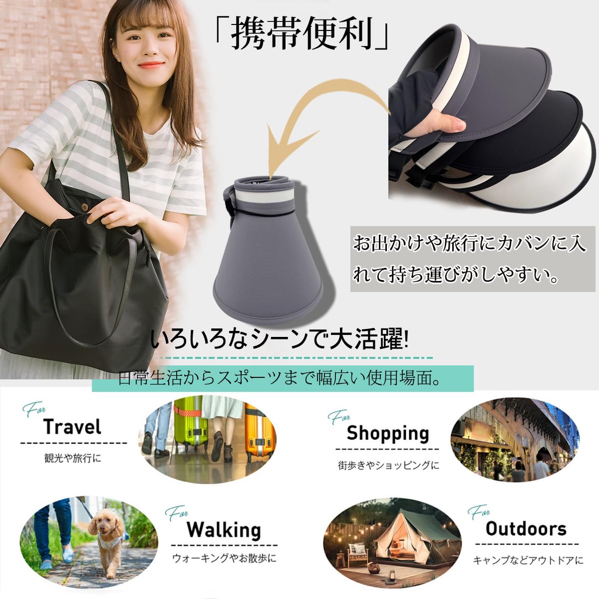 4.紫外線カットに欠かせないのレディースサンバイザーです。両面には冷却効果のあるがポリエステル繊維の生地を採用し、暑い夏の日でもひんやりとした冷感をお楽しみいただけます。【UPF50+加工】13CMのつばは顔全体を覆いた、つば内側の硬い板にはUVカット効果のコーティングが加工され、UVカット率最高値UPF50+、広めのつばで約99%の紫外線カット!【汗吸収バンド】インナー部分は吸汗性に優れたスポンジ素材を使用しており、柔らかく快適な着用感を実現。メッシュ構造で通気性と速乾性に優れ、頭部の爽やかさを維持します。サンバイザーは髪型がくずれにくいのでまとめ髪の時などに重宝します。