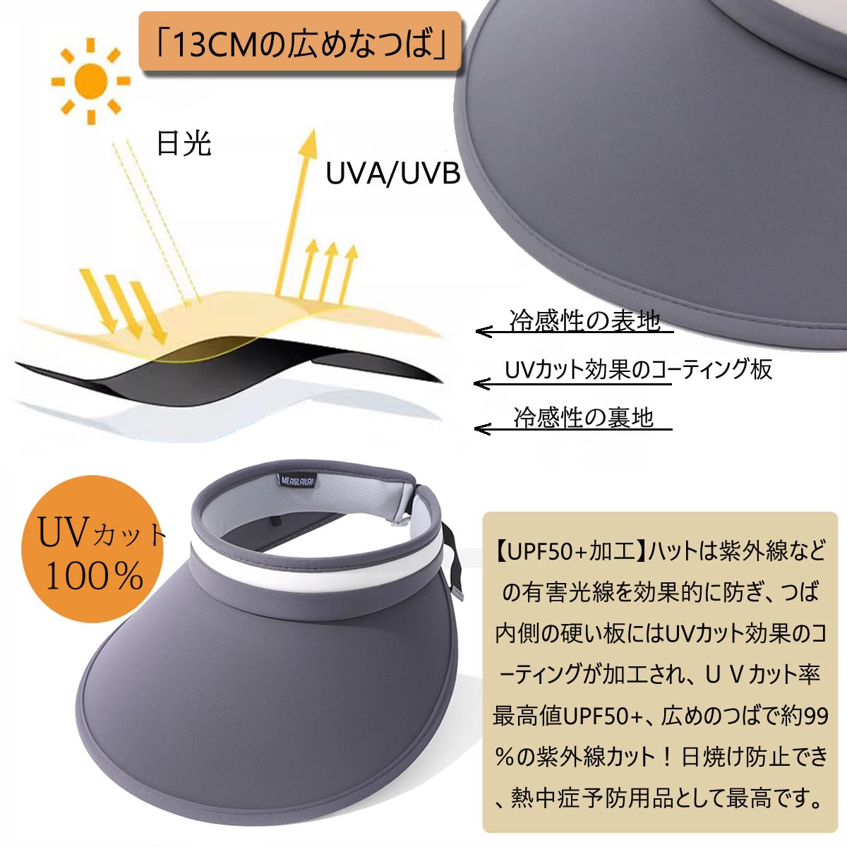 夏には熱中症を予防や紫外線カットに欠かせないのサンバイザー。紫外線遮蔽率99%以上UPF50+!13CMのつばは顔全体を覆います。顔をしっかりガードできるからうっかり日焼けしちゃった、日射病を防止します!大きめで快適仕様、日差しが強くなってきたので毎日使っています。風が吹いても、調節可能な顎紐付きで帽子が飛ばされるのを防ぎます。涼しくて軽いです。海水浴、ビーチ遊び、ボート、野球観戦、ピクニック、釣り、登山、ランニング、テニス、ゴルフ、旅行などのアウトドアの活動にお勧めします!