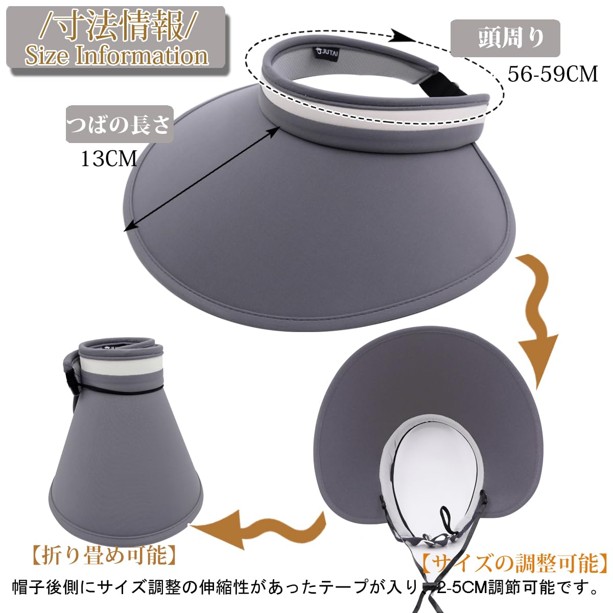 2.サイズ:頭周り約56-59cm大きめフリーサイズと大きめ仕様。つば約13cm、重さ115g。帽子後ろの調整ゴムベルトが着脱式、2-5CM調節可能です。