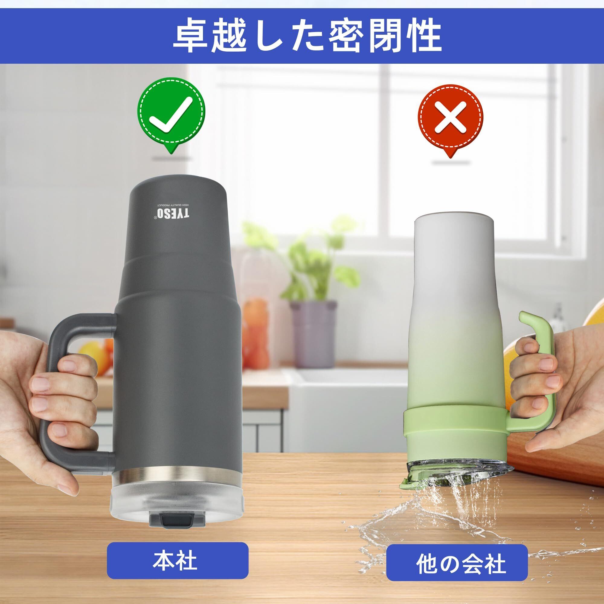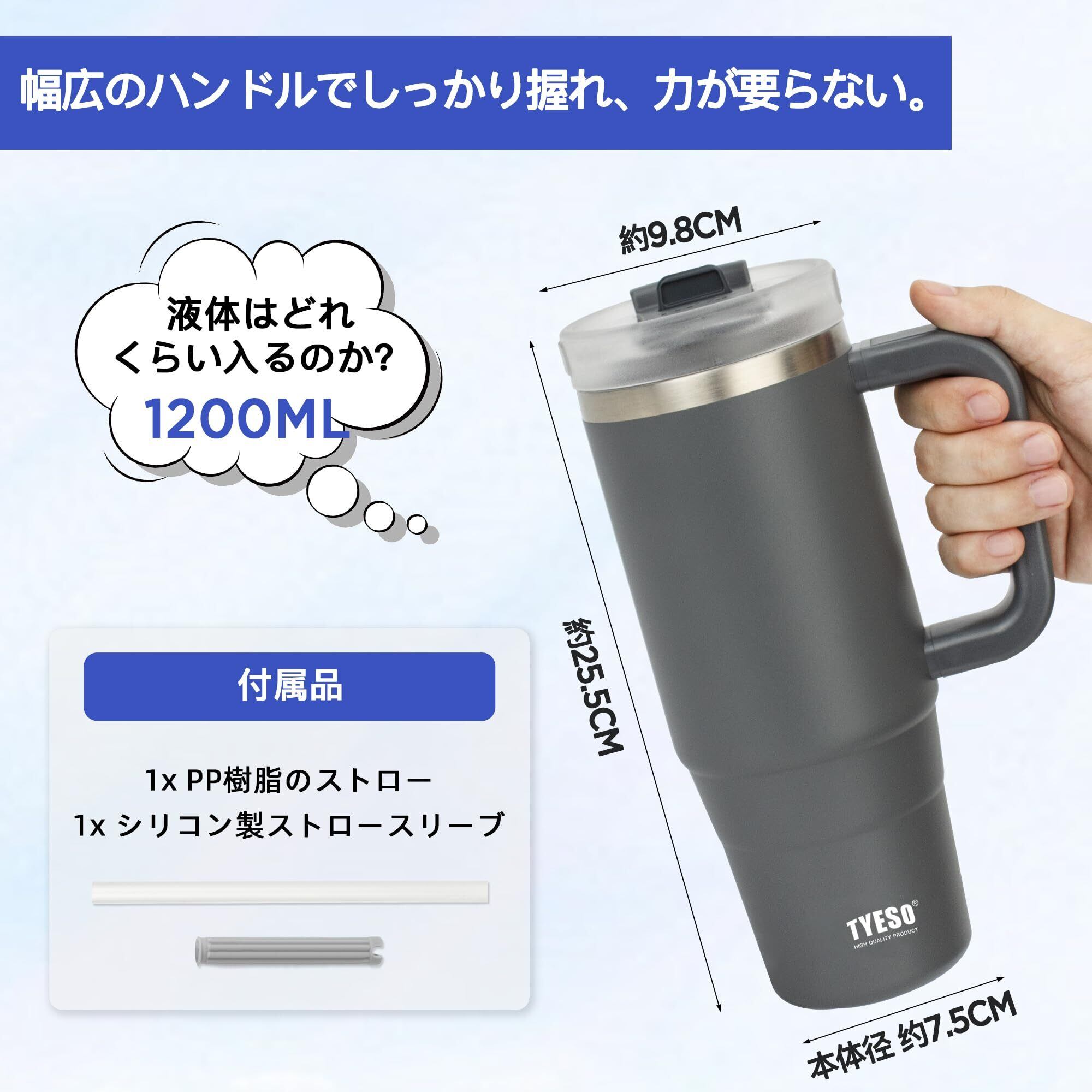 TYESO タンブラー 1.2L 水筒 保冷 ステンレスボトル ウォーターボトル ストロー 取っ手付き ジョッキ アウトドア 真空断熱 二重構造 広口 大容量 直飲 女の子 男の子 1200ml グレー