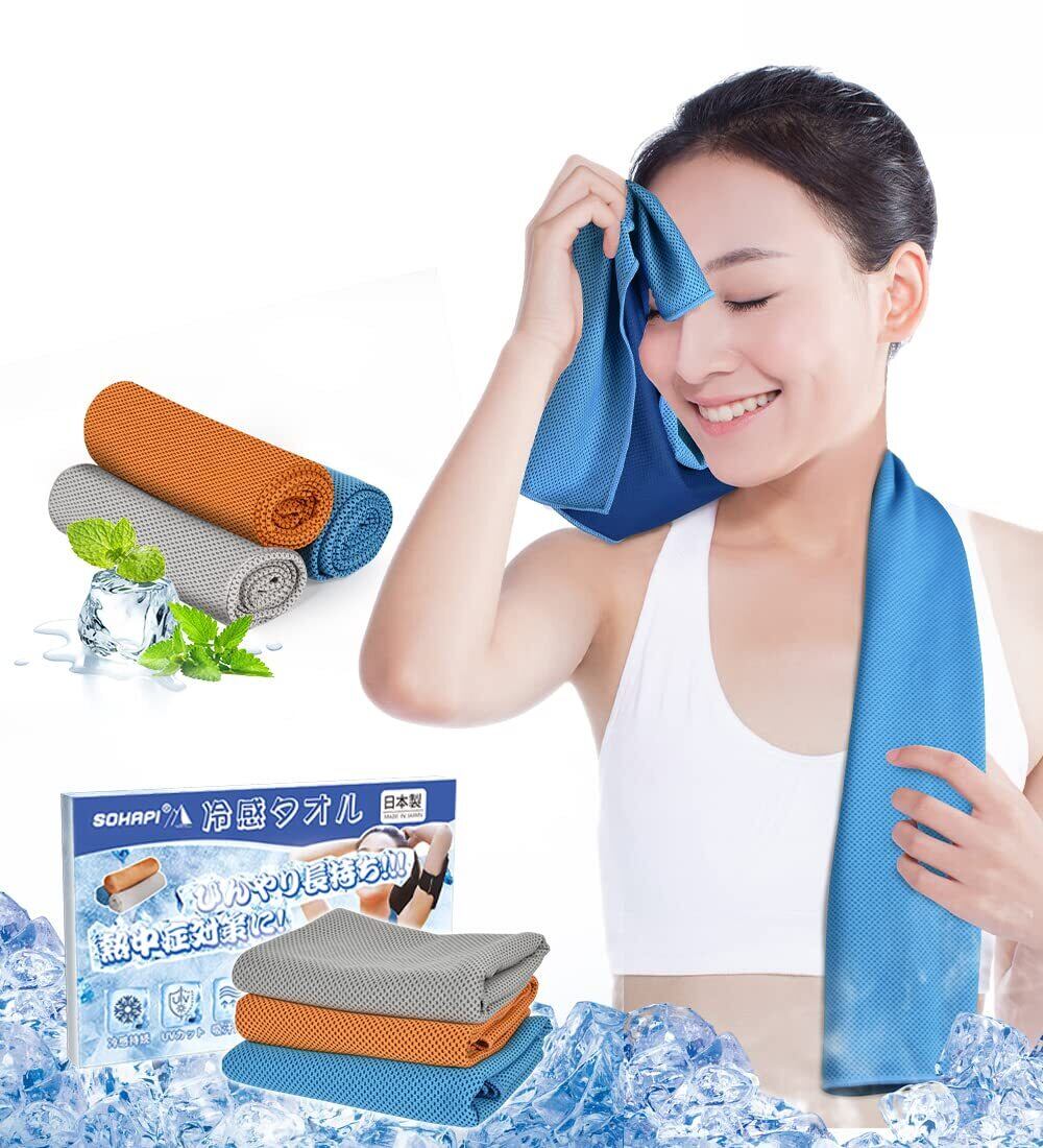 【クールタオル・持続冷感】SOHAPI冷感タオルは100%冷感繊維素材を採用した、タオルから水が蒸発する際、気化熱の作用で効率よく冷却効果が得られ、 タオルがすぐに冷たくなります。水で濡らして絞った後、タオルを振るだけでさっと冷ますことができます。水分が残った状態であれば、ぬるくなっても揺るだけで涼しさが戻ります。この冷却タオルは効率的に体の表面温度を下げ、生地に水分が含まれていれば振ることで何度でも冷感体験できます!