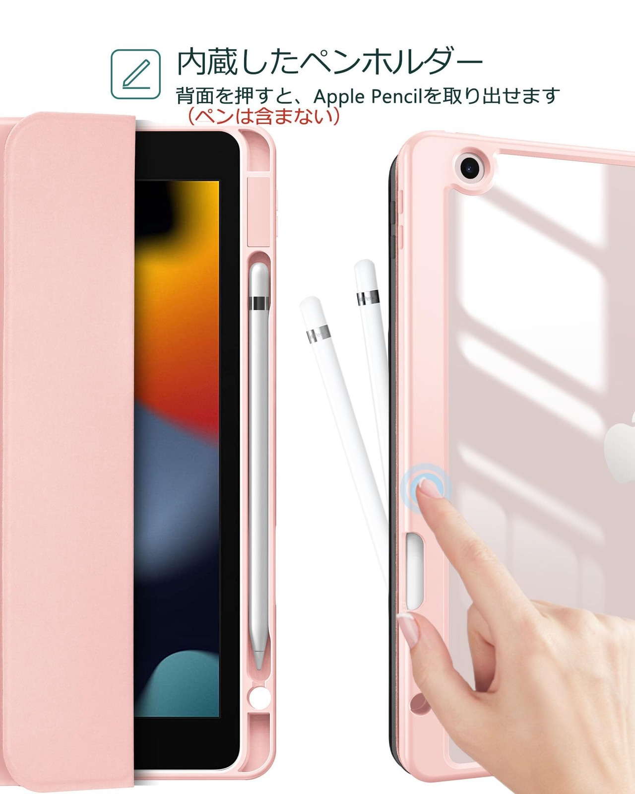 ペンホルダー付いて、Apple Pencilの収納とワイヤレス充電もサポートします。